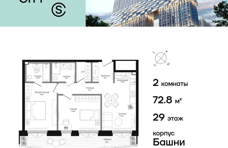 Прямая продажа от застройщика. Продаётся 2-к квартира общей площадью 73.74 кв. м с предчистовой отделкой в ЖК «Селигер Сити» на 29-м этаже башни Лисицкого. Корпуса четвертой очереди ЖК «Селигер сити» названы в честь трех великих представителей науки и архитектуры, новаторское видение которых — слишком смелое для своего времени — нашло воплощение в уникальных домах жилого комплекса. Вдохновленные авангардными идеями знаменитого советского архитектора Эля Лисицкого, архитекторы создали яркий центр притяжения всего района, задающий новый стандарт жизни в современном мегаполисе — две высокие «Башни Лисицкого» с современной интерпретацией горизонтального небоскреба. Преимущества проекта: Первые три очереди сданы. • 2 минуты пешком от метро «Селигерская» • Архитектурное решение от голландского бюро MLA + • 8 корпусов разной этажности от 8 до 45 этажей • Одна из самых больших придомовых территорий в Москве — размером с 4 футбольных поля • Огороженная охраняемая территория, круглосуточное видеонаблюдение • Европейский подход к благоустройству от бюро WOWHaus: детские площадки для разных возрастов, спортивные площадки, площадки воркаута, дорожки для бега и пеших прогулок, скейтпарк, хоккейная площадка, площадка для выгула собак • Искусственный пруд на территории комплекса с благоустроенной набережной и мостом • Продуманная концепция инфраструктуры: уютные кафе и рестораны, супермаркет, магазин фермерских продуктов, бытовые службы, салон красоты, детские сады • Панорамные окна высотой до 2,5 м, в корпусах 3 очереди витражное остекление высотой до 4,2 м • Широкий выбор квартир — от компактных студий до просторных квартир с тремя спальнями и пентхаусов • Четыре вида дизайнерской отделки квартир от бюро Вlank Architects • Возможность купить квартиру с предчистовой отделкой white box • «Умный дом» на платформе Ujin. Система безопасности, вход на территорию и в подъезд по биометрии или BLE-метке, въезд в паркинг по считывателю номера, контроль климата. Все для комфортной жизни! • Лобби по индивидуальному дизайн проекту от европейского бюро Вlank Architects: лаунж-зоны, ресепшен, колясочная, помещение для мытья лап животным после прогулки • Подземный паркинг на 2189 машино-мест по индивидуальному дизайну, с зарядными устройствами для электромобилей, постами для подкачки шин и келлерами • Надежный девелопер с опытом премиальных проектов MR Group Расположение комплекса: • 2 минуты от станции метро «Селигерская» • 7 минут на машине до станции метро «Окружная» • Предусмотрен удобный выезд в сторону ТТК (всего 9 км или 15 минут без пробок) • МКАД в 10 минутах на машине Компания MR Group предлагает своим клиентам специальные условия приобретения квартир в рамках программ ипотечного кредитования от банков-партнеров.О застройщике