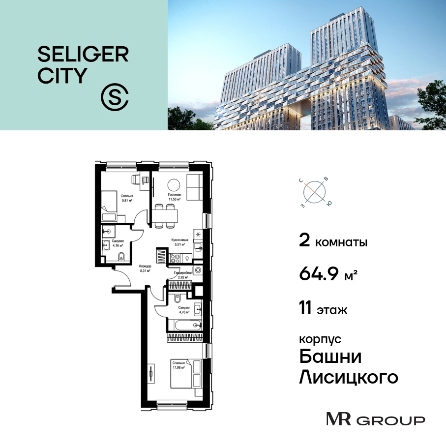 Прямая продажа от застройщика. Продаётся 2-к квартира общей площадью 64.98 кв. м с предчистовой отделкой в ЖК «Селигер Сити» на 11-м этаже башни Лисицкого. Корпуса четвертой очереди ЖК «Селигер сити» названы в честь трех великих представителей науки и архитектуры, новаторское видение которых — слишком смелое для своего времени — нашло воплощение в уникальных домах жилого комплекса. Вдохновленные авангардными идеями знаменитого советского архитектора Эля Лисицкого, архитекторы создали яркий центр притяжения всего района, задающий новый стандарт жизни в современном мегаполисе — две высокие «Башни Лисицкого» с современной интерпретацией горизонтального небоскреба. Преимущества проекта: Первые три очереди сданы. • 2 минуты пешком от метро «Селигерская» • Архитектурное решение от голландского бюро MLA + • 8 корпусов разной этажности от 8 до 45 этажей • Одна из самых больших придомовых территорий в Москве — размером с 4 футбольных поля • Огороженная охраняемая территория, круглосуточное видеонаблюдение • Европейский подход к благоустройству от бюро WOWHaus: детские площадки для разных возрастов, спортивные площадки, площадки воркаута, дорожки для бега и пеших прогулок, скейтпарк, хоккейная площадка, площадка для выгула собак • Искусственный пруд на территории комплекса с благоустроенной набережной и мостом • Продуманная концепция инфраструктуры: уютные кафе и рестораны, супермаркет, магазин фермерских продуктов, бытовые службы, салон красоты, детские сады • Панорамные окна высотой до 2,5 м, в корпусах 3 очереди витражное остекление высотой до 4,2 м • Широкий выбор квартир — от компактных студий до просторных квартир с тремя спальнями и пентхаусов • Четыре вида дизайнерской отделки квартир от бюро Вlank Architects • Возможность купить квартиру с предчистовой отделкой white box • «Умный дом» на платформе Ujin. Система безопасности, вход на территорию и в подъезд по биометрии или BLE-метке, въезд в паркинг по считывателю номера, контроль климата. Все для комфортной жизни! • Лобби по индивидуальному дизайн проекту от европейского бюро Вlank Architects: лаунж-зоны, ресепшен, колясочная, помещение для мытья лап животным после прогулки • Подземный паркинг на 2189 машино-мест по индивидуальному дизайну, с зарядными устройствами для электромобилей, постами для подкачки шин и келлерами • Надежный девелопер с опытом премиальных проектов MR Group Расположение комплекса: • 2 минуты от станции метро «Селигерская» • 7 минут на машине до станции метро «Окружная» • Предусмотрен удобный выезд в сторону ТТК (всего 9 км или 15 минут без пробок) • МКАД в 10 минутах на машине Компания MR Group предлагает своим клиентам специальные условия приобретения квартир в рамках программ ипотечного кредитования от банков-партнеров.О застройщике