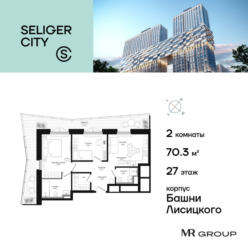 Прямая продажа от застройщика. Продаётся 2-к квартира общей площадью 70.32 кв. м без отделки в ЖК «Селигер Сити» на 27-м этаже башни Лисицкого. Корпуса четвертой очереди ЖК «Селигер сити» названы в честь трех великих представителей науки и архитектуры, новаторское видение которых — слишком смелое для своего времени — нашло воплощение в уникальных домах жилого комплекса. Вдохновленные авангардными идеями знаменитого советского архитектора Эля Лисицкого, архитекторы создали яркий центр притяжения всего района, задающий новый стандарт жизни в современном мегаполисе — две высокие «Башни Лисицкого» с современной интерпретацией горизонтального небоскреба. Преимущества проекта: Первые три очереди сданы. • 2 минуты пешком от метро «Селигерская» • Архитектурное решение от голландского бюро MLA + • 8 корпусов разной этажности от 8 до 45 этажей • Одна из самых больших придомовых территорий в Москве — размером с 4 футбольных поля • Огороженная охраняемая территория, круглосуточное видеонаблюдение • Европейский подход к благоустройству от бюро WOWHaus: детские площадки для разных возрастов, спортивные площадки, площадки воркаута, дорожки для бега и пеших прогулок, скейтпарк, хоккейная площадка, площадка для выгула собак • Искусственный пруд на территории комплекса с благоустроенной набережной и мостом • Продуманная концепция инфраструктуры: уютные кафе и рестораны, супермаркет, магазин фермерских продуктов, бытовые службы, салон красоты, детские сады • Панорамные окна высотой до 2,5 м, в корпусах 3 очереди витражное остекление высотой до 4,2 м • Широкий выбор квартир — от компактных студий до просторных квартир с тремя спальнями и пентхаусов • Четыре вида дизайнерской отделки квартир от бюро Вlank Architects • Возможность купить квартиру с предчистовой отделкой white box • «Умный дом» на платформе Ujin. Система безопасности, вход на территорию и в подъезд по биометрии или BLE-метке, въезд в паркинг по считывателю номера, контроль климата. Все для комфортной жизни! • Лобби по индивидуальному дизайн проекту от европейского бюро Вlank Architects: лаунж-зоны, ресепшен, колясочная, помещение для мытья лап животным после прогулки • Подземный паркинг на 2189 машино-мест по индивидуальному дизайну, с зарядными устройствами для электромобилей, постами для подкачки шин и келлерами • Надежный девелопер с опытом премиальных проектов MR Group Расположение комплекса: • 2 минуты от станции метро «Селигерская» • 7 минут на машине до станции метро «Окружная» • Предусмотрен удобный выезд в сторону ТТК (всего 9 км или 15 минут без пробок) • МКАД в 10 минутах на машине Компания MR Group предлагает своим клиентам специальные условия приобретения квартир в рамках программ ипотечного кредитования от банков-партнеров.О застройщике