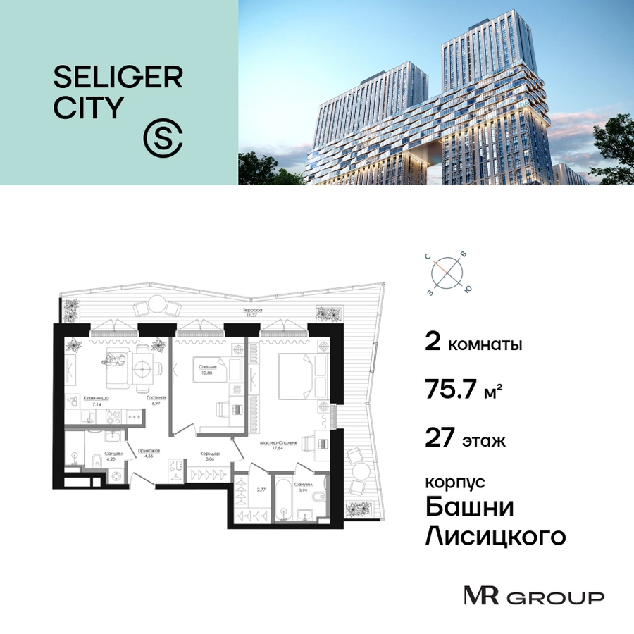 Прямая продажа от застройщика. Продаётся 2-к квартира общей площадью 75.76 кв. м без отделки в ЖК «Селигер Сити» на 27-м этаже башни Лисицкого. Корпуса четвертой очереди ЖК «Селигер сити» названы в честь трех великих представителей науки и архитектуры, новаторское видение которых — слишком смелое для своего времени — нашло воплощение в уникальных домах жилого комплекса. Вдохновленные авангардными идеями знаменитого советского архитектора Эля Лисицкого, архитекторы создали яркий центр притяжения всего района, задающий новый стандарт жизни в современном мегаполисе — две высокие «Башни Лисицкого» с современной интерпретацией горизонтального небоскреба. Преимущества проекта: Первые три очереди сданы. • 2 минуты пешком от метро «Селигерская» • Архитектурное решение от голландского бюро MLA + • 8 корпусов разной этажности от 8 до 45 этажей • Одна из самых больших придомовых территорий в Москве — размером с 4 футбольных поля • Огороженная охраняемая территория, круглосуточное видеонаблюдение • Европейский подход к благоустройству от бюро WOWHaus: детские площадки для разных возрастов, спортивные площадки, площадки воркаута, дорожки для бега и пеших прогулок, скейтпарк, хоккейная площадка, площадка для выгула собак • Искусственный пруд на территории комплекса с благоустроенной набережной и мостом • Продуманная концепция инфраструктуры: уютные кафе и рестораны, супермаркет, магазин фермерских продуктов, бытовые службы, салон красоты, детские сады • Панорамные окна высотой до 2,5 м, в корпусах 3 очереди витражное остекление высотой до 4,2 м • Широкий выбор квартир — от компактных студий до просторных квартир с тремя спальнями и пентхаусов • Четыре вида дизайнерской отделки квартир от бюро Вlank Architects • Возможность купить квартиру с предчистовой отделкой white box • «Умный дом» на платформе Ujin. Система безопасности, вход на территорию и в подъезд по биометрии или BLE-метке, въезд в паркинг по считывателю номера, контроль климата. Все для комфортной жизни! • Лобби по индивидуальному дизайн проекту от европейского бюро Вlank Architects: лаунж-зоны, ресепшен, колясочная, помещение для мытья лап животным после прогулки • Подземный паркинг на 2189 машино-мест по индивидуальному дизайну, с зарядными устройствами для электромобилей, постами для подкачки шин и келлерами • Надежный девелопер с опытом премиальных проектов MR Group Расположение комплекса: • 2 минуты от станции метро «Селигерская» • 7 минут на машине до станции метро «Окружная» • Предусмотрен удобный выезд в сторону ТТК (всего 9 км или 15 минут без пробок) • МКАД в 10 минутах на машине Компания MR Group предлагает своим клиентам специальные условия приобретения квартир в рамках программ ипотечного кредитования от банков-партнеров.О застройщике
