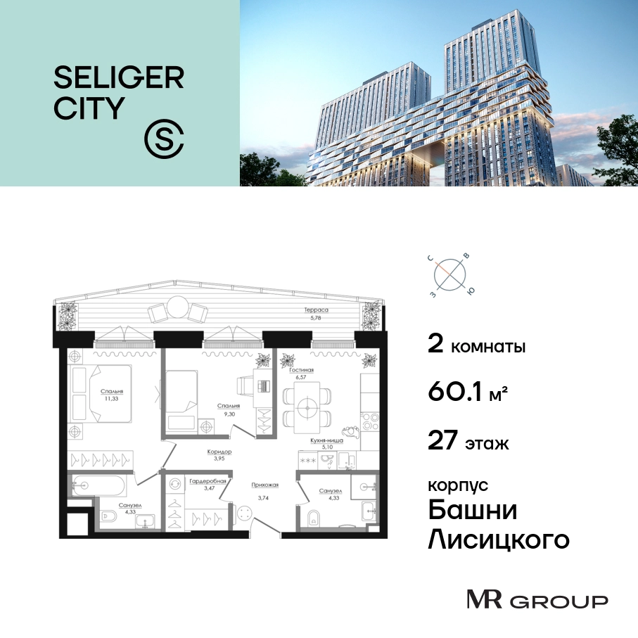 Прямая продажа от застройщика. Продаётся 2-к квартира общей площадью 60.16 кв. м без отделки в ЖК «Селигер Сити» на 27-м этаже башни Лисицкого. Корпуса четвертой очереди ЖК «Селигер сити» названы в честь трех великих представителей науки и архитектуры, новаторское видение которых — слишком смелое для своего времени — нашло воплощение в уникальных домах жилого комплекса. Вдохновленные авангардными идеями знаменитого советского архитектора Эля Лисицкого, архитекторы создали яркий центр притяжения всего района, задающий новый стандарт жизни в современном мегаполисе — две высокие «Башни Лисицкого» с современной интерпретацией горизонтального небоскреба. Преимущества проекта: Первые три очереди сданы. • 2 минуты пешком от метро «Селигерская» • Архитектурное решение от голландского бюро MLA + • 8 корпусов разной этажности от 8 до 45 этажей • Одна из самых больших придомовых территорий в Москве — размером с 4 футбольных поля • Огороженная охраняемая территория, круглосуточное видеонаблюдение • Европейский подход к благоустройству от бюро WOWHaus: детские площадки для разных возрастов, спортивные площадки, площадки воркаута, дорожки для бега и пеших прогулок, скейтпарк, хоккейная площадка, площадка для выгула собак • Искусственный пруд на территории комплекса с благоустроенной набережной и мостом • Продуманная концепция инфраструктуры: уютные кафе и рестораны, супермаркет, магазин фермерских продуктов, бытовые службы, салон красоты, детские сады • Панорамные окна высотой до 2,5 м, в корпусах 3 очереди витражное остекление высотой до 4,2 м • Широкий выбор квартир — от компактных студий до просторных квартир с тремя спальнями и пентхаусов • Четыре вида дизайнерской отделки квартир от бюро Вlank Architects • Возможность купить квартиру с предчистовой отделкой white box • «Умный дом» на платформе Ujin. Система безопасности, вход на территорию и в подъезд по биометрии или BLE-метке, въезд в паркинг по считывателю номера, контроль климата. Все для комфортной жизни! • Лобби по индивидуальному дизайн проекту от европейского бюро Вlank Architects: лаунж-зоны, ресепшен, колясочная, помещение для мытья лап животным после прогулки • Подземный паркинг на 2189 машино-мест по индивидуальному дизайну, с зарядными устройствами для электромобилей, постами для подкачки шин и келлерами • Надежный девелопер с опытом премиальных проектов MR Group Расположение комплекса: • 2 минуты от станции метро «Селигерская» • 7 минут на машине до станции метро «Окружная» • Предусмотрен удобный выезд в сторону ТТК (всего 9 км или 15 минут без пробок) • МКАД в 10 минутах на машине Компания MR Group предлагает своим клиентам специальные условия приобретения квартир в рамках программ ипотечного кредитования от банков-партнеров.О застройщике