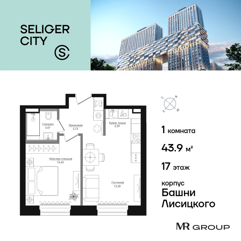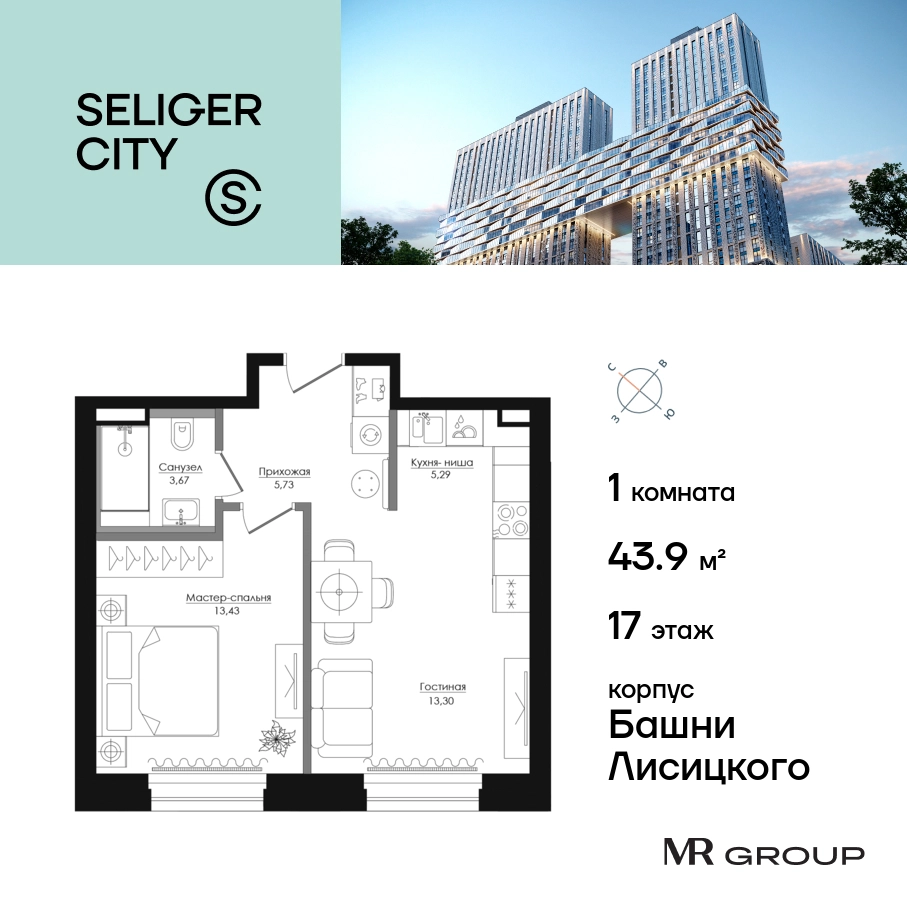Прямая продажа от застройщика. Продаётся 1-к квартира общей площадью 43.94 кв. м без отделки в ЖК «Селигер Сити» на 17-м этаже башни Лисицкого. Корпуса четвертой очереди ЖК «Селигер сити» названы в честь трех великих представителей науки и архитектуры, новаторское видение которых — слишком смелое для своего времени — нашло воплощение в уникальных домах жилого комплекса. Вдохновленные авангардными идеями знаменитого советского архитектора Эля Лисицкого, архитекторы создали яркий центр притяжения всего района, задающий новый стандарт жизни в современном мегаполисе — две высокие «Башни Лисицкого» с современной интерпретацией горизонтального небоскреба. Преимущества проекта: Первые три очереди сданы. • 2 минуты пешком от метро «Селигерская» • Архитектурное решение от голландского бюро MLA + • 8 корпусов разной этажности от 8 до 45 этажей • Одна из самых больших придомовых территорий в Москве — размером с 4 футбольных поля • Огороженная охраняемая территория, круглосуточное видеонаблюдение • Европейский подход к благоустройству от бюро WOWHaus: детские площадки для разных возрастов, спортивные площадки, площадки воркаута, дорожки для бега и пеших прогулок, скейтпарк, хоккейная площадка, площадка для выгула собак • Искусственный пруд на территории комплекса с благоустроенной набережной и мостом • Продуманная концепция инфраструктуры: уютные кафе и рестораны, супермаркет, магазин фермерских продуктов, бытовые службы, салон красоты, детские сады • Панорамные окна высотой до 2,5 м, в корпусах 3 очереди витражное остекление высотой до 4,2 м • Широкий выбор квартир — от компактных студий до просторных квартир с тремя спальнями и пентхаусов • Четыре вида дизайнерской отделки квартир от бюро Вlank Architects • Возможность купить квартиру с предчистовой отделкой white box • «Умный дом» на платформе Ujin. Система безопасности, вход на территорию и в подъезд по биометрии или BLE-метке, въезд в паркинг по считывателю номера, контроль климата. Все для комфортной жизни! • Лобби по индивидуальному дизайн проекту от европейского бюро Вlank Architects: лаунж-зоны, ресепшен, колясочная, помещение для мытья лап животным после прогулки • Подземный паркинг на 2189 машино-мест по индивидуальному дизайну, с зарядными устройствами для электромобилей, постами для подкачки шин и келлерами • Надежный девелопер с опытом премиальных проектов MR Group Расположение комплекса: • 2 минуты от станции метро «Селигерская» • 7 минут на машине до станции метро «Окружная» • Предусмотрен удобный выезд в сторону ТТК (всего 9 км или 15 минут без пробок) • МКАД в 10 минутах на машине Компания MR Group предлагает своим клиентам специальные условия приобретения квартир в рамках программ ипотечного кредитования от банков-партнеров.О застройщике