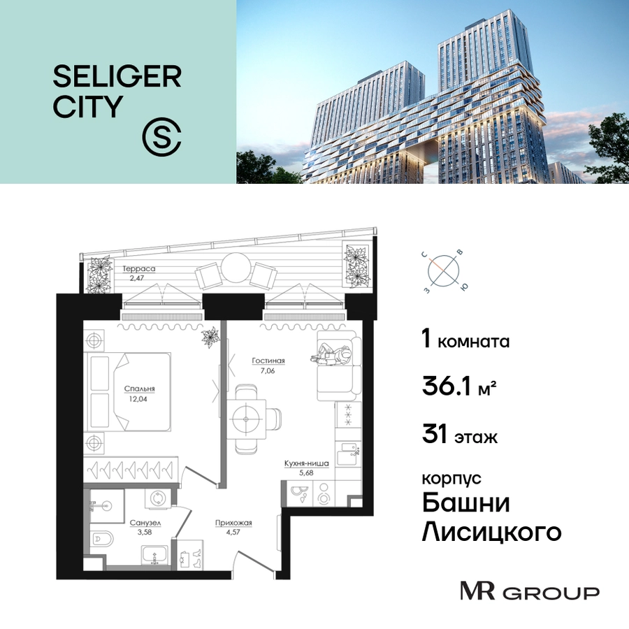 Прямая продажа от застройщика. Продаётся 1-к квартира общей площадью 36.17 кв. м без отделки в ЖК «Селигер Сити» на 31-м этаже башни Лисицкого. Корпуса четвертой очереди ЖК «Селигер сити» названы в честь трех великих представителей науки и архитектуры, новаторское видение которых — слишком смелое для своего времени — нашло воплощение в уникальных домах жилого комплекса. Вдохновленные авангардными идеями знаменитого советского архитектора Эля Лисицкого, архитекторы создали яркий центр притяжения всего района, задающий новый стандарт жизни в современном мегаполисе — две высокие «Башни Лисицкого» с современной интерпретацией горизонтального небоскреба. Преимущества проекта: Первые три очереди сданы. • 2 минуты пешком от метро «Селигерская» • Архитектурное решение от голландского бюро MLA + • 8 корпусов разной этажности от 8 до 45 этажей • Одна из самых больших придомовых территорий в Москве — размером с 4 футбольных поля • Огороженная охраняемая территория, круглосуточное видеонаблюдение • Европейский подход к благоустройству от бюро WOWHaus: детские площадки для разных возрастов, спортивные площадки, площадки воркаута, дорожки для бега и пеших прогулок, скейтпарк, хоккейная площадка, площадка для выгула собак • Искусственный пруд на территории комплекса с благоустроенной набережной и мостом • Продуманная концепция инфраструктуры: уютные кафе и рестораны, супермаркет, магазин фермерских продуктов, бытовые службы, салон красоты, детские сады • Панорамные окна высотой до 2,5 м, в корпусах 3 очереди витражное остекление высотой до 4,2 м • Широкий выбор квартир — от компактных студий до просторных квартир с тремя спальнями и пентхаусов • Четыре вида дизайнерской отделки квартир от бюро Вlank Architects • Возможность купить квартиру с предчистовой отделкой white box • «Умный дом» на платформе Ujin. Система безопасности, вход на территорию и в подъезд по биометрии или BLE-метке, въезд в паркинг по считывателю номера, контроль климата. Все для комфортной жизни! • Лобби по индивидуальному дизайн проекту от европейского бюро Вlank Architects: лаунж-зоны, ресепшен, колясочная, помещение для мытья лап животным после прогулки • Подземный паркинг на 2189 машино-мест по индивидуальному дизайну, с зарядными устройствами для электромобилей, постами для подкачки шин и келлерами • Надежный девелопер с опытом премиальных проектов MR Group Расположение комплекса: • 2 минуты от станции метро «Селигерская» • 7 минут на машине до станции метро «Окружная» • Предусмотрен удобный выезд в сторону ТТК (всего 9 км или 15 минут без пробок) • МКАД в 10 минутах на машине Компания MR Group предлагает своим клиентам специальные условия приобретения квартир в рамках программ ипотечного кредитования от банков-партнеров.О застройщике