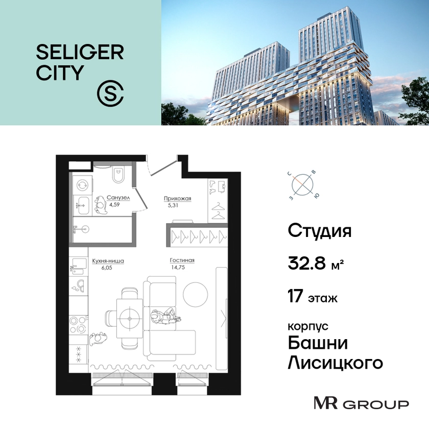 Прямая продажа от застройщика. Продаётся студия общей площадью 32.83 кв. м без отделки в ЖК «Селигер Сити» на 17-м этаже башни Лисицкого. Корпуса четвертой очереди ЖК «Селигер сити» названы в честь трех великих представителей науки и архитектуры, новаторское видение которых — слишком смелое для своего времени — нашло воплощение в уникальных домах жилого комплекса. Вдохновленные авангардными идеями знаменитого советского архитектора Эля Лисицкого, архитекторы создали яркий центр притяжения всего района, задающий новый стандарт жизни в современном мегаполисе — две высокие «Башни Лисицкого» с современной интерпретацией горизонтального небоскреба. Преимущества проекта: Первые три очереди сданы. • 2 минуты пешком от метро «Селигерская» • Архитектурное решение от голландского бюро MLA + • 8 корпусов разной этажности от 8 до 45 этажей • Одна из самых больших придомовых территорий в Москве — размером с 4 футбольных поля • Огороженная охраняемая территория, круглосуточное видеонаблюдение • Европейский подход к благоустройству от бюро WOWHaus: детские площадки для разных возрастов, спортивные площадки, площадки воркаута, дорожки для бега и пеших прогулок, скейтпарк, хоккейная площадка, площадка для выгула собак • Искусственный пруд на территории комплекса с благоустроенной набережной и мостом • Продуманная концепция инфраструктуры: уютные кафе и рестораны, супермаркет, магазин фермерских продуктов, бытовые службы, салон красоты, детские сады • Панорамные окна высотой до 2,5 м, в корпусах 3 очереди витражное остекление высотой до 4,2 м • Широкий выбор квартир — от компактных студий до просторных квартир с тремя спальнями и пентхаусов • Четыре вида дизайнерской отделки квартир от бюро Вlank Architects • Возможность купить квартиру с предчистовой отделкой white box • «Умный дом» на платформе Ujin. Система безопасности, вход на территорию и в подъезд по биометрии или BLE-метке, въезд в паркинг по считывателю номера, контроль климата. Все для комфортной жизни! • Лобби по индивидуальному дизайн проекту от европейского бюро Вlank Architects: лаунж-зоны, ресепшен, колясочная, помещение для мытья лап животным после прогулки • Подземный паркинг на 2189 машино-мест по индивидуальному дизайну, с зарядными устройствами для электромобилей, постами для подкачки шин и келлерами • Надежный девелопер с опытом премиальных проектов MR Group Расположение комплекса: • 2 минуты от станции метро «Селигерская» • 7 минут на машине до станции метро «Окружная» • Предусмотрен удобный выезд в сторону ТТК (всего 9 км или 15 минут без пробок) • МКАД в 10 минутах на машине Компания MR Group предлагает своим клиентам специальные условия приобретения квартир в рамках программ ипотечного кредитования от банков-партнеров.О застройщике