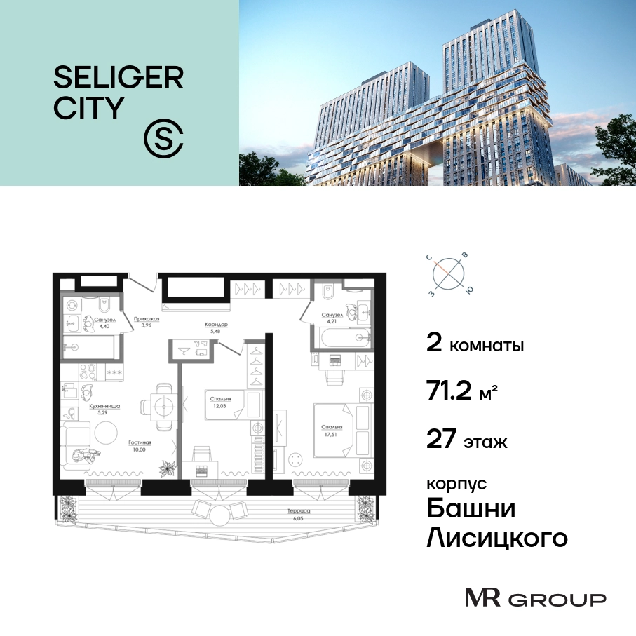 Прямая продажа от застройщика. Продаётся 2-к квартира общей площадью 71.21 кв. м без отделки в ЖК «Селигер Сити» на 27-м этаже башни Лисицкого. Корпуса четвертой очереди ЖК «Селигер сити» названы в честь трех великих представителей науки и архитектуры, новаторское видение которых — слишком смелое для своего времени — нашло воплощение в уникальных домах жилого комплекса. Вдохновленные авангардными идеями знаменитого советского архитектора Эля Лисицкого, архитекторы создали яркий центр притяжения всего района, задающий новый стандарт жизни в современном мегаполисе — две высокие «Башни Лисицкого» с современной интерпретацией горизонтального небоскреба. Преимущества проекта: Первые три очереди сданы. • 2 минуты пешком от метро «Селигерская» • Архитектурное решение от голландского бюро MLA + • 8 корпусов разной этажности от 8 до 45 этажей • Одна из самых больших придомовых территорий в Москве — размером с 4 футбольных поля • Огороженная охраняемая территория, круглосуточное видеонаблюдение • Европейский подход к благоустройству от бюро WOWHaus: детские площадки для разных возрастов, спортивные площадки, площадки воркаута, дорожки для бега и пеших прогулок, скейтпарк, хоккейная площадка, площадка для выгула собак • Искусственный пруд на территории комплекса с благоустроенной набережной и мостом • Продуманная концепция инфраструктуры: уютные кафе и рестораны, супермаркет, магазин фермерских продуктов, бытовые службы, салон красоты, детские сады • Панорамные окна высотой до 2,5 м, в корпусах 3 очереди витражное остекление высотой до 4,2 м • Широкий выбор квартир — от компактных студий до просторных квартир с тремя спальнями и пентхаусов • Четыре вида дизайнерской отделки квартир от бюро Вlank Architects • Возможность купить квартиру с предчистовой отделкой white box • «Умный дом» на платформе Ujin. Система безопасности, вход на территорию и в подъезд по биометрии или BLE-метке, въезд в паркинг по считывателю номера, контроль климата. Все для комфортной жизни! • Лобби по индивидуальному дизайн проекту от европейского бюро Вlank Architects: лаунж-зоны, ресепшен, колясочная, помещение для мытья лап животным после прогулки • Подземный паркинг на 2189 машино-мест по индивидуальному дизайну, с зарядными устройствами для электромобилей, постами для подкачки шин и келлерами • Надежный девелопер с опытом премиальных проектов MR Group Расположение комплекса: • 2 минуты от станции метро «Селигерская» • 7 минут на машине до станции метро «Окружная» • Предусмотрен удобный выезд в сторону ТТК (всего 9 км или 15 минут без пробок) • МКАД в 10 минутах на машине Компания MR Group предлагает своим клиентам специальные условия приобретения квартир в рамках программ ипотечного кредитования от банков-партнеров.О застройщике