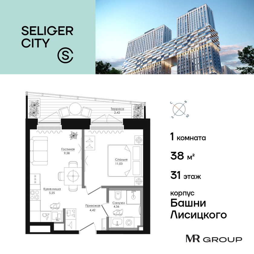 Прямая продажа от застройщика. Продаётся 1-к квартира общей площадью 38.05 кв. м без отделки в ЖК «Селигер Сити» на 31-м этаже башни Лисицкого. Корпуса четвертой очереди ЖК «Селигер сити» названы в честь трех великих представителей науки и архитектуры, новаторское видение которых — слишком смелое для своего времени — нашло воплощение в уникальных домах жилого комплекса. Вдохновленные авангардными идеями знаменитого советского архитектора Эля Лисицкого, архитекторы создали яркий центр притяжения всего района, задающий новый стандарт жизни в современном мегаполисе — две высокие «Башни Лисицкого» с современной интерпретацией горизонтального небоскреба. Преимущества проекта: Первые три очереди сданы. • 2 минуты пешком от метро «Селигерская» • Архитектурное решение от голландского бюро MLA + • 8 корпусов разной этажности от 8 до 45 этажей • Одна из самых больших придомовых территорий в Москве — размером с 4 футбольных поля • Огороженная охраняемая территория, круглосуточное видеонаблюдение • Европейский подход к благоустройству от бюро WOWHaus: детские площадки для разных возрастов, спортивные площадки, площадки воркаута, дорожки для бега и пеших прогулок, скейтпарк, хоккейная площадка, площадка для выгула собак • Искусственный пруд на территории комплекса с благоустроенной набережной и мостом • Продуманная концепция инфраструктуры: уютные кафе и рестораны, супермаркет, магазин фермерских продуктов, бытовые службы, салон красоты, детские сады • Панорамные окна высотой до 2,5 м, в корпусах 3 очереди витражное остекление высотой до 4,2 м • Широкий выбор квартир — от компактных студий до просторных квартир с тремя спальнями и пентхаусов • Четыре вида дизайнерской отделки квартир от бюро Вlank Architects • Возможность купить квартиру с предчистовой отделкой white box • «Умный дом» на платформе Ujin. Система безопасности, вход на территорию и в подъезд по биометрии или BLE-метке, въезд в паркинг по считывателю номера, контроль климата. Все для комфортной жизни! • Лобби по индивидуальному дизайн проекту от европейского бюро Вlank Architects: лаунж-зоны, ресепшен, колясочная, помещение для мытья лап животным после прогулки • Подземный паркинг на 2189 машино-мест по индивидуальному дизайну, с зарядными устройствами для электромобилей, постами для подкачки шин и келлерами • Надежный девелопер с опытом премиальных проектов MR Group Расположение комплекса: • 2 минуты от станции метро «Селигерская» • 7 минут на машине до станции метро «Окружная» • Предусмотрен удобный выезд в сторону ТТК (всего 9 км или 15 минут без пробок) • МКАД в 10 минутах на машине Компания MR Group предлагает своим клиентам специальные условия приобретения квартир в рамках программ ипотечного кредитования от банков-партнеров.О застройщике