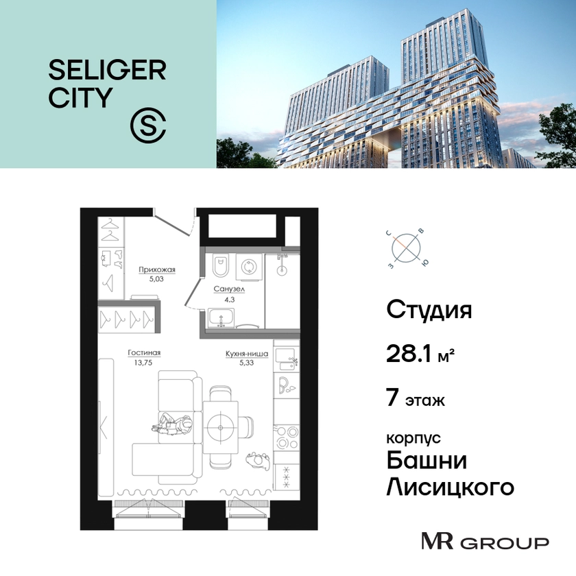 Прямая продажа от застройщика. Продаётся студия общей площадью 28.16 кв. м с предчистовой отделкой в ЖК «Селигер Сити» на 7-м этаже башни Лисицкого. Корпуса четвертой очереди ЖК «Селигер сити» названы в честь трех великих представителей науки и архитектуры, новаторское видение которых — слишком смелое для своего времени — нашло воплощение в уникальных домах жилого комплекса. Вдохновленные авангардными идеями знаменитого советского архитектора Эля Лисицкого, архитекторы создали яркий центр притяжения всего района, задающий новый стандарт жизни в современном мегаполисе — две высокие «Башни Лисицкого» с современной интерпретацией горизонтального небоскреба. Преимущества проекта: Первые три очереди сданы. • 2 минуты пешком от метро «Селигерская» • Архитектурное решение от голландского бюро MLA + • 8 корпусов разной этажности от 8 до 45 этажей • Одна из самых больших придомовых территорий в Москве — размером с 4 футбольных поля • Огороженная охраняемая территория, круглосуточное видеонаблюдение • Европейский подход к благоустройству от бюро WOWHaus: детские площадки для разных возрастов, спортивные площадки, площадки воркаута, дорожки для бега и пеших прогулок, скейтпарк, хоккейная площадка, площадка для выгула собак • Искусственный пруд на территории комплекса с благоустроенной набережной и мостом • Продуманная концепция инфраструктуры: уютные кафе и рестораны, супермаркет, магазин фермерских продуктов, бытовые службы, салон красоты, детские сады • Панорамные окна высотой до 2,5 м, в корпусах 3 очереди витражное остекление высотой до 4,2 м • Широкий выбор квартир — от компактных студий до просторных квартир с тремя спальнями и пентхаусов • Четыре вида дизайнерской отделки квартир от бюро Вlank Architects • Возможность купить квартиру с предчистовой отделкой white box • «Умный дом» на платформе Ujin. Система безопасности, вход на территорию и в подъезд по биометрии или BLE-метке, въезд в паркинг по считывателю номера, контроль климата. Все для комфортной жизни! • Лобби по индивидуальному дизайн проекту от европейского бюро Вlank Architects: лаунж-зоны, ресепшен, колясочная, помещение для мытья лап животным после прогулки • Подземный паркинг на 2189 машино-мест по индивидуальному дизайну, с зарядными устройствами для электромобилей, постами для подкачки шин и келлерами • Надежный девелопер с опытом премиальных проектов MR Group Расположение комплекса: • 2 минуты от станции метро «Селигерская» • 7 минут на машине до станции метро «Окружная» • Предусмотрен удобный выезд в сторону ТТК (всего 9 км или 15 минут без пробок) • МКАД в 10 минутах на машине Компания MR Group предлагает своим клиентам специальные условия приобретения квартир в рамках программ ипотечного кредитования от банков-партнеров.О застройщике