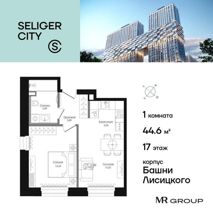 Прямая продажа от застройщика. Продаётся 1-к квартира общей площадью 44.64 кв. м без отделки в ЖК «Селигер Сити» на 17-м этаже башни Лисицкого. Корпуса четвертой очереди ЖК «Селигер сити» названы в честь трех великих представителей науки и архитектуры, новаторское видение которых — слишком смелое для своего времени — нашло воплощение в уникальных домах жилого комплекса. Вдохновленные авангардными идеями знаменитого советского архитектора Эля Лисицкого, архитекторы создали яркий центр притяжения всего района, задающий новый стандарт жизни в современном мегаполисе — две высокие «Башни Лисицкого» с современной интерпретацией горизонтального небоскреба. Преимущества проекта: Первые три очереди сданы. • 2 минуты пешком от метро «Селигерская» • Архитектурное решение от голландского бюро MLA + • 8 корпусов разной этажности от 8 до 45 этажей • Одна из самых больших придомовых территорий в Москве — размером с 4 футбольных поля • Огороженная охраняемая территория, круглосуточное видеонаблюдение • Европейский подход к благоустройству от бюро WOWHaus: детские площадки для разных возрастов, спортивные площадки, площадки воркаута, дорожки для бега и пеших прогулок, скейтпарк, хоккейная площадка, площадка для выгула собак • Искусственный пруд на территории комплекса с благоустроенной набережной и мостом • Продуманная концепция инфраструктуры: уютные кафе и рестораны, супермаркет, магазин фермерских продуктов, бытовые службы, салон красоты, детские сады • Панорамные окна высотой до 2,5 м, в корпусах 3 очереди витражное остекление высотой до 4,2 м • Широкий выбор квартир — от компактных студий до просторных квартир с тремя спальнями и пентхаусов • Четыре вида дизайнерской отделки квартир от бюро Вlank Architects • Возможность купить квартиру с предчистовой отделкой white box • «Умный дом» на платформе Ujin. Система безопасности, вход на территорию и в подъезд по биометрии или BLE-метке, въезд в паркинг по считывателю номера, контроль климата. Все для комфортной жизни! • Лобби по индивидуальному дизайн проекту от европейского бюро Вlank Architects: лаунж-зоны, ресепшен, колясочная, помещение для мытья лап животным после прогулки • Подземный паркинг на 2189 машино-мест по индивидуальному дизайну, с зарядными устройствами для электромобилей, постами для подкачки шин и келлерами • Надежный девелопер с опытом премиальных проектов MR Group Расположение комплекса: • 2 минуты от станции метро «Селигерская» • 7 минут на машине до станции метро «Окружная» • Предусмотрен удобный выезд в сторону ТТК (всего 9 км или 15 минут без пробок) • МКАД в 10 минутах на машине Компания MR Group предлагает своим клиентам специальные условия приобретения квартир в рамках программ ипотечного кредитования от банков-партнеров.О застройщике