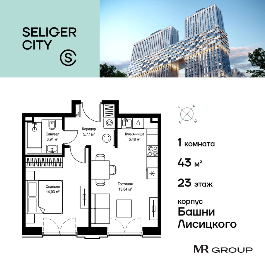 Прямая продажа от застройщика. Продаётся 1-к квартира общей площадью 43.06 кв. м с предчистовой отделкой в ЖК «Селигер Сити» на 23-м этаже башни Лисицкого. Корпуса четвертой очереди ЖК «Селигер сити» названы в честь трех великих представителей науки и архитектуры, новаторское видение которых — слишком смелое для своего времени — нашло воплощение в уникальных домах жилого комплекса. Вдохновленные авангардными идеями знаменитого советского архитектора Эля Лисицкого, архитекторы создали яркий центр притяжения всего района, задающий новый стандарт жизни в современном мегаполисе — две высокие «Башни Лисицкого» с современной интерпретацией горизонтального небоскреба. Преимущества проекта: Первые три очереди сданы. • 2 минуты пешком от метро «Селигерская» • Архитектурное решение от голландского бюро MLA + • 8 корпусов разной этажности от 8 до 45 этажей • Одна из самых больших придомовых территорий в Москве — размером с 4 футбольных поля • Огороженная охраняемая территория, круглосуточное видеонаблюдение • Европейский подход к благоустройству от бюро WOWHaus: детские площадки для разных возрастов, спортивные площадки, площадки воркаута, дорожки для бега и пеших прогулок, скейтпарк, хоккейная площадка, площадка для выгула собак • Искусственный пруд на территории комплекса с благоустроенной набережной и мостом • Продуманная концепция инфраструктуры: уютные кафе и рестораны, супермаркет, магазин фермерских продуктов, бытовые службы, салон красоты, детские сады • Панорамные окна высотой до 2,5 м, в корпусах 3 очереди витражное остекление высотой до 4,2 м • Широкий выбор квартир — от компактных студий до просторных квартир с тремя спальнями и пентхаусов • Четыре вида дизайнерской отделки квартир от бюро Вlank Architects • Возможность купить квартиру с предчистовой отделкой white box • «Умный дом» на платформе Ujin. Система безопасности, вход на территорию и в подъезд по биометрии или BLE-метке, въезд в паркинг по считывателю номера, контроль климата. Все для комфортной жизни! • Лобби по индивидуальному дизайн проекту от европейского бюро Вlank Architects: лаунж-зоны, ресепшен, колясочная, помещение для мытья лап животным после прогулки • Подземный паркинг на 2189 машино-мест по индивидуальному дизайну, с зарядными устройствами для электромобилей, постами для подкачки шин и келлерами • Надежный девелопер с опытом премиальных проектов MR Group Расположение комплекса: • 2 минуты от станции метро «Селигерская» • 7 минут на машине до станции метро «Окружная» • Предусмотрен удобный выезд в сторону ТТК (всего 9 км или 15 минут без пробок) • МКАД в 10 минутах на машине Компания MR Group предлагает своим клиентам специальные условия приобретения квартир в рамках программ ипотечного кредитования от банков-партнеров.О застройщике