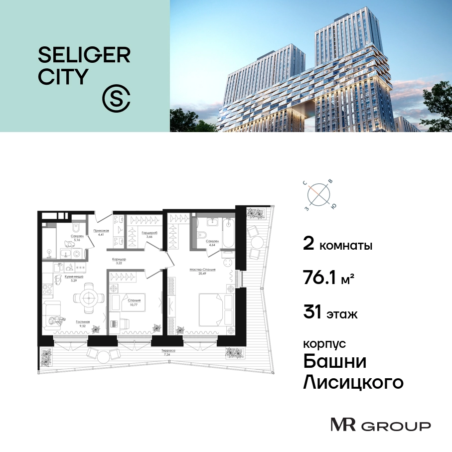 Прямая продажа от застройщика. Продаётся 2-к квартира общей площадью 76.11 кв. м без отделки в ЖК «Селигер Сити» на 31-м этаже башни Лисицкого. Корпуса четвертой очереди ЖК «Селигер сити» названы в честь трех великих представителей науки и архитектуры, новаторское видение которых — слишком смелое для своего времени — нашло воплощение в уникальных домах жилого комплекса. Вдохновленные авангардными идеями знаменитого советского архитектора Эля Лисицкого, архитекторы создали яркий центр притяжения всего района, задающий новый стандарт жизни в современном мегаполисе — две высокие «Башни Лисицкого» с современной интерпретацией горизонтального небоскреба. Преимущества проекта: Первые три очереди сданы. • 2 минуты пешком от метро «Селигерская» • Архитектурное решение от голландского бюро MLA + • 8 корпусов разной этажности от 8 до 45 этажей • Одна из самых больших придомовых территорий в Москве — размером с 4 футбольных поля • Огороженная охраняемая территория, круглосуточное видеонаблюдение • Европейский подход к благоустройству от бюро WOWHaus: детские площадки для разных возрастов, спортивные площадки, площадки воркаута, дорожки для бега и пеших прогулок, скейтпарк, хоккейная площадка, площадка для выгула собак • Искусственный пруд на территории комплекса с благоустроенной набережной и мостом • Продуманная концепция инфраструктуры: уютные кафе и рестораны, супермаркет, магазин фермерских продуктов, бытовые службы, салон красоты, детские сады • Панорамные окна высотой до 2,5 м, в корпусах 3 очереди витражное остекление высотой до 4,2 м • Широкий выбор квартир — от компактных студий до просторных квартир с тремя спальнями и пентхаусов • Четыре вида дизайнерской отделки квартир от бюро Вlank Architects • Возможность купить квартиру с предчистовой отделкой white box • «Умный дом» на платформе Ujin. Система безопасности, вход на территорию и в подъезд по биометрии или BLE-метке, въезд в паркинг по считывателю номера, контроль климата. Все для комфортной жизни! • Лобби по индивидуальному дизайн проекту от европейского бюро Вlank Architects: лаунж-зоны, ресепшен, колясочная, помещение для мытья лап животным после прогулки • Подземный паркинг на 2189 машино-мест по индивидуальному дизайну, с зарядными устройствами для электромобилей, постами для подкачки шин и келлерами • Надежный девелопер с опытом премиальных проектов MR Group Расположение комплекса: • 2 минуты от станции метро «Селигерская» • 7 минут на машине до станции метро «Окружная» • Предусмотрен удобный выезд в сторону ТТК (всего 9 км или 15 минут без пробок) • МКАД в 10 минутах на машине Компания MR Group предлагает своим клиентам специальные условия приобретения квартир в рамках программ ипотечного кредитования от банков-партнеров.О застройщике