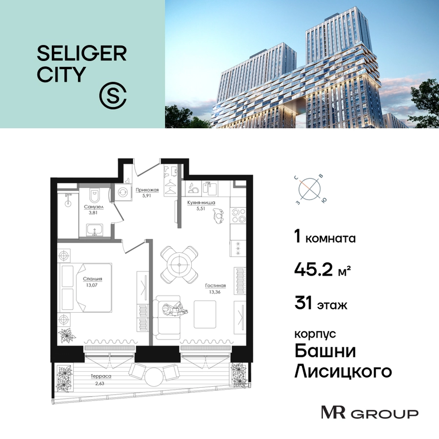 Прямая продажа от застройщика. Продаётся 1-к квартира общей площадью 45.25 кв. м без отделки в ЖК «Селигер Сити» на 31-м этаже башни Лисицкого. Корпуса четвертой очереди ЖК «Селигер сити» названы в честь трех великих представителей науки и архитектуры, новаторское видение которых — слишком смелое для своего времени — нашло воплощение в уникальных домах жилого комплекса. Вдохновленные авангардными идеями знаменитого советского архитектора Эля Лисицкого, архитекторы создали яркий центр притяжения всего района, задающий новый стандарт жизни в современном мегаполисе — две высокие «Башни Лисицкого» с современной интерпретацией горизонтального небоскреба. Преимущества проекта: Первые три очереди сданы. • 2 минуты пешком от метро «Селигерская» • Архитектурное решение от голландского бюро MLA + • 8 корпусов разной этажности от 8 до 45 этажей • Одна из самых больших придомовых территорий в Москве — размером с 4 футбольных поля • Огороженная охраняемая территория, круглосуточное видеонаблюдение • Европейский подход к благоустройству от бюро WOWHaus: детские площадки для разных возрастов, спортивные площадки, площадки воркаута, дорожки для бега и пеших прогулок, скейтпарк, хоккейная площадка, площадка для выгула собак • Искусственный пруд на территории комплекса с благоустроенной набережной и мостом • Продуманная концепция инфраструктуры: уютные кафе и рестораны, супермаркет, магазин фермерских продуктов, бытовые службы, салон красоты, детские сады • Панорамные окна высотой до 2,5 м, в корпусах 3 очереди витражное остекление высотой до 4,2 м • Широкий выбор квартир — от компактных студий до просторных квартир с тремя спальнями и пентхаусов • Четыре вида дизайнерской отделки квартир от бюро Вlank Architects • Возможность купить квартиру с предчистовой отделкой white box • «Умный дом» на платформе Ujin. Система безопасности, вход на территорию и в подъезд по биометрии или BLE-метке, въезд в паркинг по считывателю номера, контроль климата. Все для комфортной жизни! • Лобби по индивидуальному дизайн проекту от европейского бюро Вlank Architects: лаунж-зоны, ресепшен, колясочная, помещение для мытья лап животным после прогулки • Подземный паркинг на 2189 машино-мест по индивидуальному дизайну, с зарядными устройствами для электромобилей, постами для подкачки шин и келлерами • Надежный девелопер с опытом премиальных проектов MR Group Расположение комплекса: • 2 минуты от станции метро «Селигерская» • 7 минут на машине до станции метро «Окружная» • Предусмотрен удобный выезд в сторону ТТК (всего 9 км или 15 минут без пробок) • МКАД в 10 минутах на машине Компания MR Group предлагает своим клиентам специальные условия приобретения квартир в рамках программ ипотечного кредитования от банков-партнеров.О застройщике
