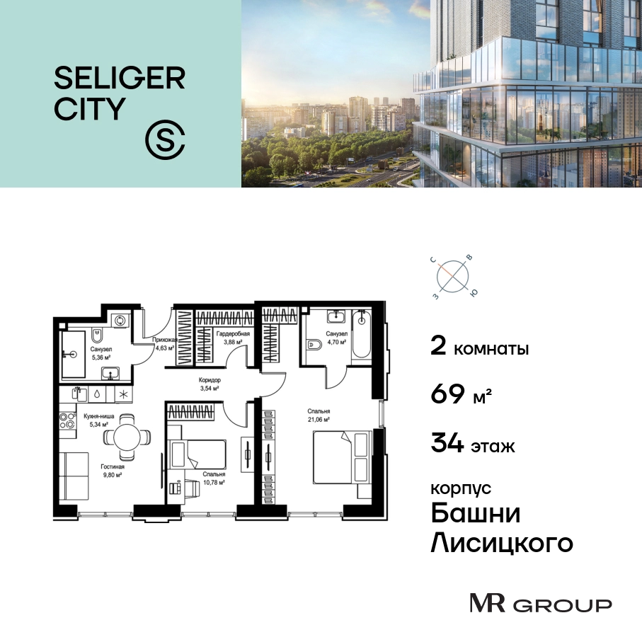 Прямая продажа от застройщика. Продаётся 2-к квартира общей площадью 69.09 кв. м без отделки в ЖК «Селигер Сити» на 34-м этаже башни Лисицкого. Корпуса четвертой очереди ЖК «Селигер сити» названы в честь трех великих представителей науки и архитектуры, новаторское видение которых — слишком смелое для своего времени — нашло воплощение в уникальных домах жилого комплекса. Вдохновленные авангардными идеями знаменитого советского архитектора Эля Лисицкого, архитекторы создали яркий центр притяжения всего района, задающий новый стандарт жизни в современном мегаполисе — две высокие «Башни Лисицкого» с современной интерпретацией горизонтального небоскреба. Преимущества проекта: Первые три очереди сданы. • 2 минуты пешком от метро «Селигерская» • Архитектурное решение от голландского бюро MLA + • 8 корпусов разной этажности от 8 до 45 этажей • Одна из самых больших придомовых территорий в Москве — размером с 4 футбольных поля • Огороженная охраняемая территория, круглосуточное видеонаблюдение • Европейский подход к благоустройству от бюро WOWHaus: детские площадки для разных возрастов, спортивные площадки, площадки воркаута, дорожки для бега и пеших прогулок, скейтпарк, хоккейная площадка, площадка для выгула собак • Искусственный пруд на территории комплекса с благоустроенной набережной и мостом • Продуманная концепция инфраструктуры: уютные кафе и рестораны, супермаркет, магазин фермерских продуктов, бытовые службы, салон красоты, детские сады • Панорамные окна высотой до 2,5 м, в корпусах 3 очереди витражное остекление высотой до 4,2 м • Широкий выбор квартир — от компактных студий до просторных квартир с тремя спальнями и пентхаусов • Четыре вида дизайнерской отделки квартир от бюро Вlank Architects • Возможность купить квартиру с предчистовой отделкой white box • «Умный дом» на платформе Ujin. Система безопасности, вход на территорию и в подъезд по биометрии или BLE-метке, въезд в паркинг по считывателю номера, контроль климата. Все для комфортной жизни! • Лобби по индивидуальному дизайн проекту от европейского бюро Вlank Architects: лаунж-зоны, ресепшен, колясочная, помещение для мытья лап животным после прогулки • Подземный паркинг на 2189 машино-мест по индивидуальному дизайну, с зарядными устройствами для электромобилей, постами для подкачки шин и келлерами • Надежный девелопер с опытом премиальных проектов MR Group Расположение комплекса: • 2 минуты от станции метро «Селигерская» • 7 минут на машине до станции метро «Окружная» • Предусмотрен удобный выезд в сторону ТТК (всего 9 км или 15 минут без пробок) • МКАД в 10 минутах на машине Компания MR Group предлагает своим клиентам специальные условия приобретения квартир в рамках программ ипотечного кредитования от банков-партнеров.О застройщике