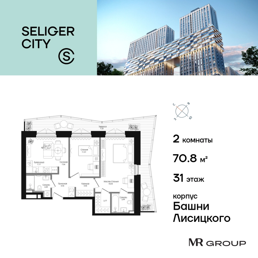 Прямая продажа от застройщика. Продаётся 2-к квартира общей площадью 70.83 кв. м без отделки в ЖК «Селигер Сити» на 31-м этаже башни Лисицкого. Корпуса четвертой очереди ЖК «Селигер сити» названы в честь трех великих представителей науки и архитектуры, новаторское видение которых — слишком смелое для своего времени — нашло воплощение в уникальных домах жилого комплекса. Вдохновленные авангардными идеями знаменитого советского архитектора Эля Лисицкого, архитекторы создали яркий центр притяжения всего района, задающий новый стандарт жизни в современном мегаполисе — две высокие «Башни Лисицкого» с современной интерпретацией горизонтального небоскреба. Преимущества проекта: Первые три очереди сданы. • 2 минуты пешком от метро «Селигерская» • Архитектурное решение от голландского бюро MLA + • 8 корпусов разной этажности от 8 до 45 этажей • Одна из самых больших придомовых территорий в Москве — размером с 4 футбольных поля • Огороженная охраняемая территория, круглосуточное видеонаблюдение • Европейский подход к благоустройству от бюро WOWHaus: детские площадки для разных возрастов, спортивные площадки, площадки воркаута, дорожки для бега и пеших прогулок, скейтпарк, хоккейная площадка, площадка для выгула собак • Искусственный пруд на территории комплекса с благоустроенной набережной и мостом • Продуманная концепция инфраструктуры: уютные кафе и рестораны, супермаркет, магазин фермерских продуктов, бытовые службы, салон красоты, детские сады • Панорамные окна высотой до 2,5 м, в корпусах 3 очереди витражное остекление высотой до 4,2 м • Широкий выбор квартир — от компактных студий до просторных квартир с тремя спальнями и пентхаусов • Четыре вида дизайнерской отделки квартир от бюро Вlank Architects • Возможность купить квартиру с предчистовой отделкой white box • «Умный дом» на платформе Ujin. Система безопасности, вход на территорию и в подъезд по биометрии или BLE-метке, въезд в паркинг по считывателю номера, контроль климата. Все для комфортной жизни! • Лобби по индивидуальному дизайн проекту от европейского бюро Вlank Architects: лаунж-зоны, ресепшен, колясочная, помещение для мытья лап животным после прогулки • Подземный паркинг на 2189 машино-мест по индивидуальному дизайну, с зарядными устройствами для электромобилей, постами для подкачки шин и келлерами • Надежный девелопер с опытом премиальных проектов MR Group Расположение комплекса: • 2 минуты от станции метро «Селигерская» • 7 минут на машине до станции метро «Окружная» • Предусмотрен удобный выезд в сторону ТТК (всего 9 км или 15 минут без пробок) • МКАД в 10 минутах на машине Компания MR Group предлагает своим клиентам специальные условия приобретения квартир в рамках программ ипотечного кредитования от банков-партнеров.О застройщике