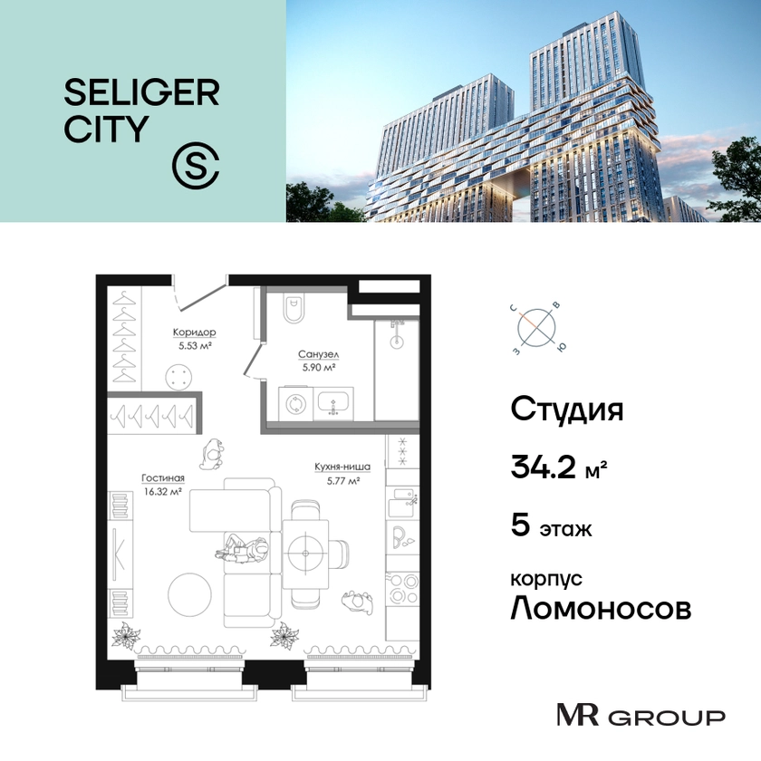Прямая продажа от застройщика. Продаётся студия общей площадью 34.28 кв. м без отделки в ЖК «Селигер Сити» на 5-м этаже корпуса Ломоносов. Корпуса четвертой очереди ЖК "Селигер сити" названы в честь трех великих представителей науки и архитектуры, новаторское видение которых слишком смелое для своего времени нашло воплощение в уникальных домах жилого комплекса. Клубный 15-этажный корпус Ломоносов расположен во дворе 4 очереди. Фасад корпуса выполнен из темного кирпича с контрастным первым этажом. Квартиры верхних этажей имеют панорамные окна и балконы с декоративным ограждением. Часть квартир на втором этаже имеют открытые террасы. На первом этаже дизайнерские интерьеры лобби выполненные по проекту бюро Вlank Architects. На жилых этажах не более 5 квартир. Преимущества проекта: • 2 минуты пешком от метро «Селигерская» • Архитектурное решение от голландского бюро MLA + • Одна из самых больших придомовых территорий в Москве • Огороженная охраняемая территория, круглосуточное видеонаблюдение • Европейский подход к благоустройству от бюро WOWHaus: появится парадный бульвар, аллея с фонтаном и арт-объектом, что дополнит уже сформированное благоустройство: детские площадки для разных возрастов, площадки для воркаута, дорожки для бега и пеших прогулок, места для отдыха • Искусственный пруд на территории комплекса с благоустроенной набережной и мостом • Продуманная концепция инфраструктуры: уютные кафе и рестораны, супермаркет, магазин фермерских продуктов, бытовые службы, салон красоты, детские сады • Ультрасовременные инженерные решения • Подземный паркинг с зарядными станциями для электромобилей, постами подкачки шин и келлерами • Лобби по индивидуальному дизайн проекту от европейского бюро Вlank Architects: лаунж-зоны, ресепшен, колясочная, помещение для мытья лап животным после прогулки • Надежный девелопер с опытом премиальных проектов MR Group Расположение комплекса: • 2 минуты от станции метро «Селигерская» • 7 минут на машине до станции метро «Окружная» • Предусмотрен удобный выезд в сторону ТТК (всего 9 км или 15 минут без пробок) • МКАД в 10 минутах на машине Компания MR Group предлагает своим клиентам специальные условия приобретения квартир в рамках программ ипотечного кредитования от банков-партнеров.О застройщике