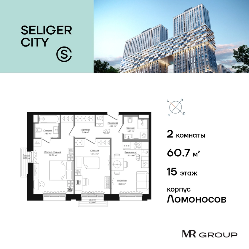 Прямая продажа от застройщика. Продаётся 2-к квартира общей площадью 60.72 кв. м без отделки в ЖК «Селигер Сити» на 15-м этаже корпуса Ломоносов. Корпуса четвертой очереди ЖК "Селигер сити" названы в честь трех великих представителей науки и архитектуры, новаторское видение которых слишком смелое для своего времени нашло воплощение в уникальных домах жилого комплекса. Клубный 15-этажный корпус Ломоносов расположен во дворе 4 очереди. Фасад корпуса выполнен из темного кирпича с контрастным первым этажом. Квартиры верхних этажей имеют панорамные окна и балконы с декоративным ограждением. Часть квартир на втором этаже имеют открытые террасы. На первом этаже дизайнерские интерьеры лобби выполненные по проекту бюро Вlank Architects. На жилых этажах не более 5 квартир. Преимущества проекта: • 2 минуты пешком от метро «Селигерская» • Архитектурное решение от голландского бюро MLA + • Одна из самых больших придомовых территорий в Москве • Огороженная охраняемая территория, круглосуточное видеонаблюдение • Европейский подход к благоустройству от бюро WOWHaus: появится парадный бульвар, аллея с фонтаном и арт-объектом, что дополнит уже сформированное благоустройство: детские площадки для разных возрастов, площадки для воркаута, дорожки для бега и пеших прогулок, места для отдыха • Искусственный пруд на территории комплекса с благоустроенной набережной и мостом • Продуманная концепция инфраструктуры: уютные кафе и рестораны, супермаркет, магазин фермерских продуктов, бытовые службы, салон красоты, детские сады • Ультрасовременные инженерные решения • Подземный паркинг с зарядными станциями для электромобилей, постами подкачки шин и келлерами • Лобби по индивидуальному дизайн проекту от европейского бюро Вlank Architects: лаунж-зоны, ресепшен, колясочная, помещение для мытья лап животным после прогулки • Надежный девелопер с опытом премиальных проектов MR Group Расположение комплекса: • 2 минуты от станции метро «Селигерская» • 7 минут на машине до станции метро «Окружная» • Предусмотрен удобный выезд в сторону ТТК (всего 9 км или 15 минут без пробок) • МКАД в 10 минутах на машине Компания MR Group предлагает своим клиентам специальные условия приобретения квартир в рамках программ ипотечного кредитования от банков-партнеров.О застройщике
