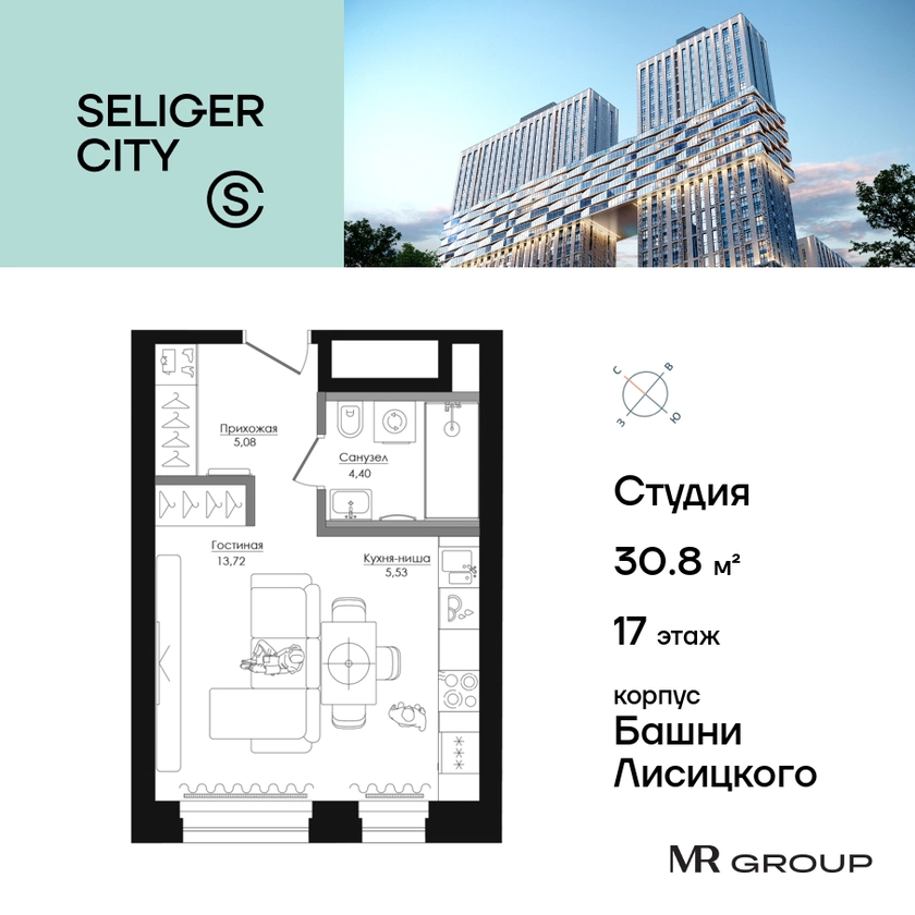 Прямая продажа от застройщика. Продаётся студия общей площадью 30.89 кв. м без отделки в ЖК «Селигер Сити» на 17-м этаже башни Лисицкого. Корпуса четвертой очереди ЖК «Селигер сити» названы в честь трех великих представителей науки и архитектуры, новаторское видение которых — слишком смелое для своего времени — нашло воплощение в уникальных домах жилого комплекса. Вдохновленные авангардными идеями знаменитого советского архитектора Эля Лисицкого, архитекторы создали яркий центр притяжения всего района, задающий новый стандарт жизни в современном мегаполисе — две высокие «Башни Лисицкого» с современной интерпретацией горизонтального небоскреба. Преимущества проекта: Первые три очереди сданы. • 2 минуты пешком от метро «Селигерская» • Архитектурное решение от голландского бюро MLA + • 8 корпусов разной этажности от 8 до 45 этажей • Одна из самых больших придомовых территорий в Москве — размером с 4 футбольных поля • Огороженная охраняемая территория, круглосуточное видеонаблюдение • Европейский подход к благоустройству от бюро WOWHaus: детские площадки для разных возрастов, спортивные площадки, площадки воркаута, дорожки для бега и пеших прогулок, скейтпарк, хоккейная площадка, площадка для выгула собак • Искусственный пруд на территории комплекса с благоустроенной набережной и мостом • Продуманная концепция инфраструктуры: уютные кафе и рестораны, супермаркет, магазин фермерских продуктов, бытовые службы, салон красоты, детские сады • Панорамные окна высотой до 2,5 м, в корпусах 3 очереди витражное остекление высотой до 4,2 м • Широкий выбор квартир — от компактных студий до просторных квартир с тремя спальнями и пентхаусов • Четыре вида дизайнерской отделки квартир от бюро Вlank Architects • Возможность купить квартиру с предчистовой отделкой white box • «Умный дом» на платформе Ujin. Система безопасности, вход на территорию и в подъезд по биометрии или BLE-метке, въезд в паркинг по считывателю номера, контроль климата. Все для комфортной жизни! • Лобби по индивидуальному дизайн проекту от европейского бюро Вlank Architects: лаунж-зоны, ресепшен, колясочная, помещение для мытья лап животным после прогулки • Подземный паркинг на 2189 машино-мест по индивидуальному дизайну, с зарядными устройствами для электромобилей, постами для подкачки шин и келлерами • Надежный девелопер с опытом премиальных проектов MR Group Расположение комплекса: • 2 минуты от станции метро «Селигерская» • 7 минут на машине до станции метро «Окружная» • Предусмотрен удобный выезд в сторону ТТК (всего 9 км или 15 минут без пробок) • МКАД в 10 минутах на машине Компания MR Group предлагает своим клиентам специальные условия приобретения квартир в рамках программ ипотечного кредитования от банков-партнеров.О застройщике