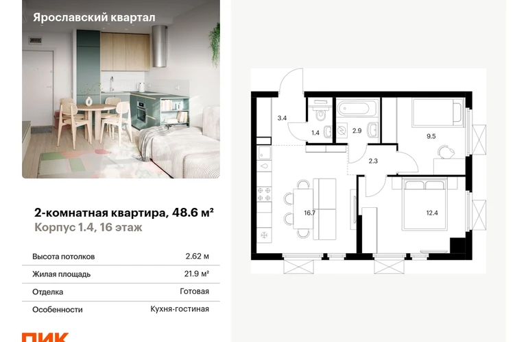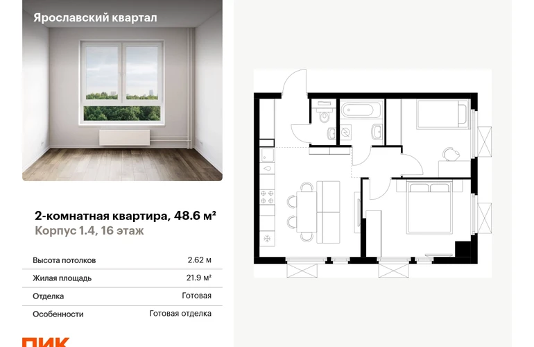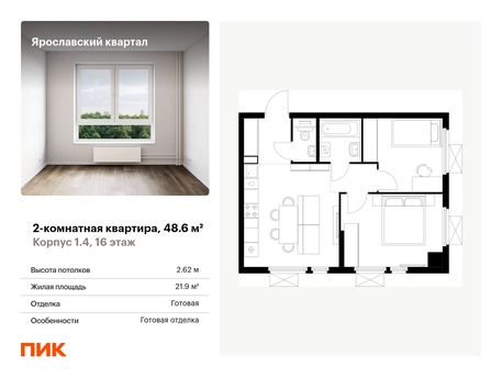 Продаётся 2-комн.квартира площадью 48.60 кв.м на 16 этаже 25 этажного дома (Корпус 1.4, секция 1) проекта ПИК Ярославский квартал. Светлый просторный подъезд на уровне земли, функциональная планировка, большие окна, с отделкой. Проект «Ярославский квартал» возводится в Мытищах, в 6 км от МКАД. Жилой квартал, состоящий из 8 корпусов, строится рядом с Ярославским шоссе и имеет удобный заезд с крупной автомагистрали. На территории проекта появится школа, детский сад и пешеходный бульвар. Индивидуальные дизайны фасадов для «Ярославского квартала» разработало петербургское архитектурное бюро RHIZOME. В их портфолио вошли работы для Московского музея современного искусства, ГЦСИ, Манифеста 10 и ЦВЗ Манеж. За 7 минут можно дойти пешком до ближайшей автобусной остановки. Столько же займёт дорога до «Лосиного острова» — облагороженного парка с разными активностями для всей семьи, благоустроенными зонами для отдыха, местами для прогулок и пробежек на свежем воздухе. Доехать на автомобиле до Ярославского шоссе получится за 3 минуты, до станции «Мытищи» — за 9 минут, до МКАД — за 15 минут. Артикул - 911572О застройщике