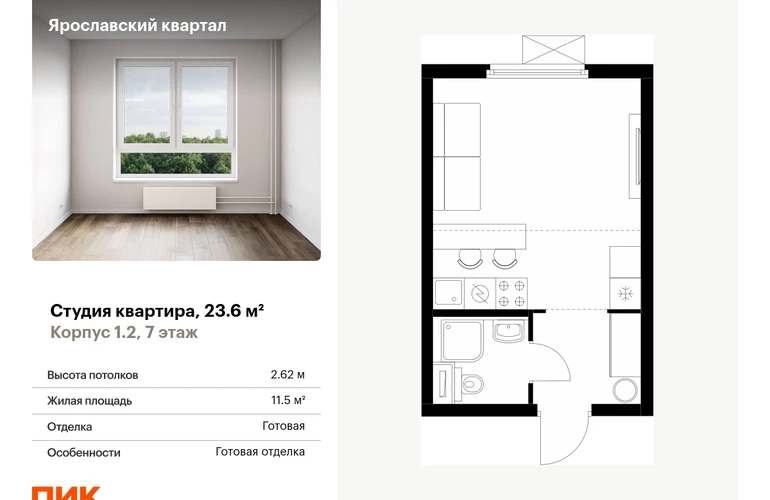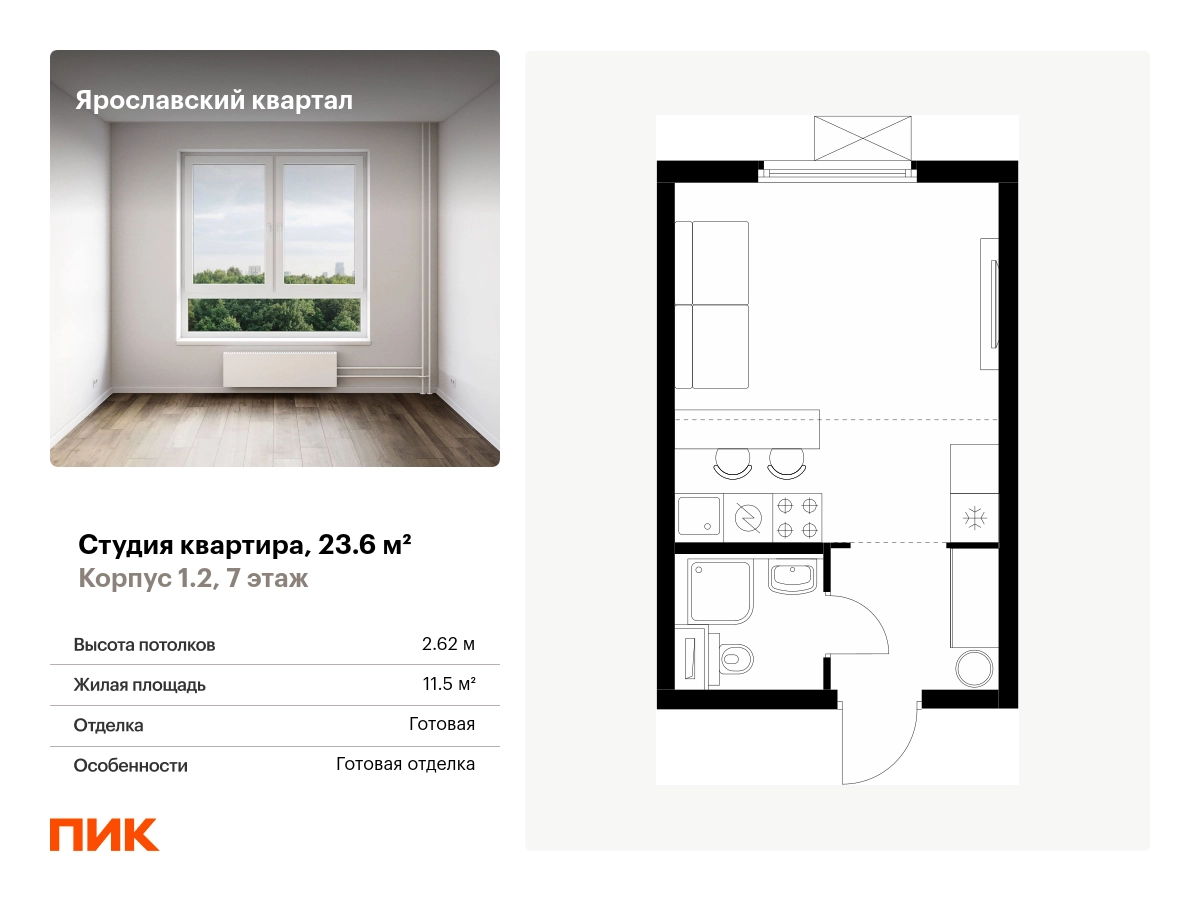 Продаётся квартира-студия площадью 23.60 кв.м на 7 этаже 25 этажного дома (Корпус 1.2, секция 1) проекта ПИК Ярославский квартал. Светлый просторный подъезд на уровне земли, функциональная планировка, большие окна, с отделкой. Проект «Ярославский квартал» возводится в Мытищах, в 6 км от МКАД. Жилой квартал, состоящий из 8 корпусов, строится рядом с Ярославским шоссе и имеет удобный заезд с крупной автомагистрали. На территории проекта появится школа, детский сад и пешеходный бульвар. Индивидуальные дизайны фасадов для «Ярославского квартала» разработало петербургское архитектурное бюро RHIZOME. В их портфолио вошли работы для Московского музея современного искусства, ГЦСИ, Манифеста 10 и ЦВЗ Манеж. За 7 минут можно дойти пешком до ближайшей автобусной остановки. Столько же займёт дорога до «Лосиного острова» — облагороженного парка с разными активностями для всей семьи, благоустроенными зонами для отдыха, местами для прогулок и пробежек на свежем воздухе. Доехать на автомобиле до Ярославского шоссе получится за 3 минуты, до станции «Мытищи» — за 9 минут, до МКАД — за 15 минут. Артикул - 910617О застройщике