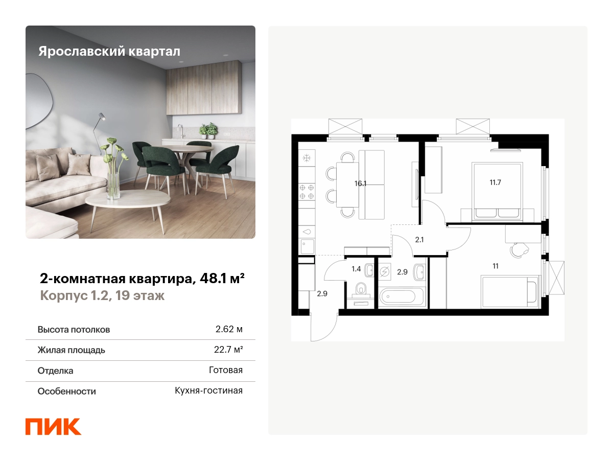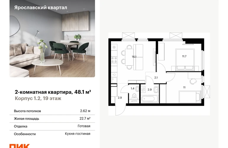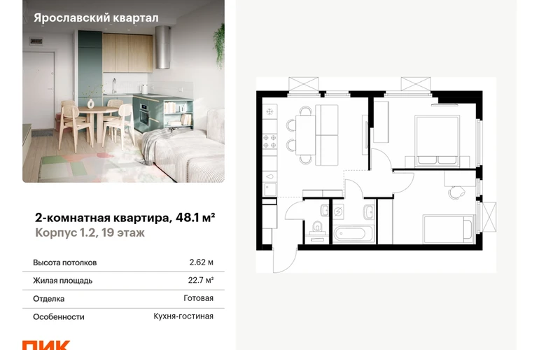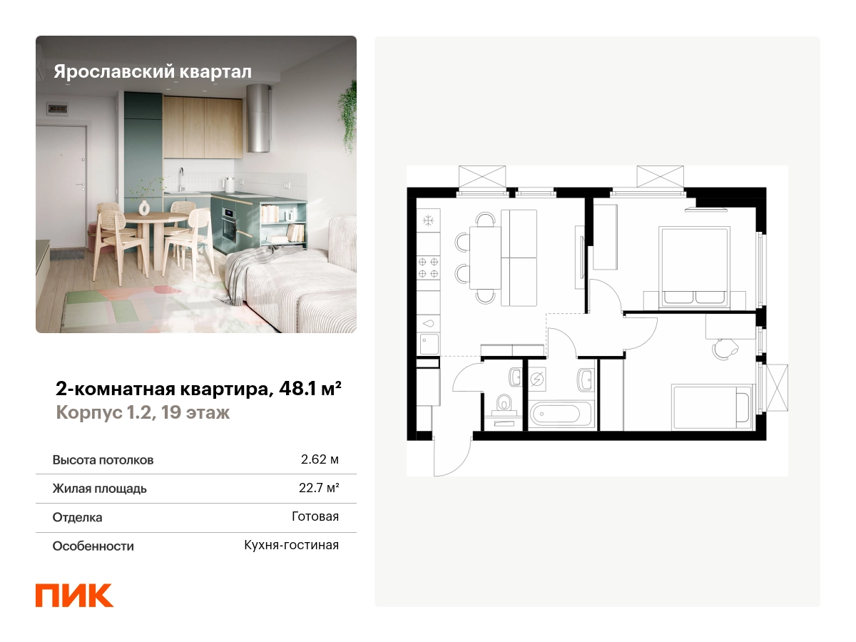 Продаётся 2-комн.квартира площадью 48.10 кв.м на 19 этаже 25 этажного дома (Корпус 1.2, секция 1) проекта ПИК Ярославский квартал. Светлый просторный подъезд на уровне земли, функциональная планировка, большие окна, с отделкой. <br> <br>Проект «Ярославский квартал» возводится в Мытищах, в 6 км от МКАД. Жилой квартал, состоящий из 8 корпусов, строится рядом с Ярославским шоссе и имеет удобный заезд с крупной автомагистрали. <br> <br>На территории проекта появится школа, детский сад и пешеходный бульвар. Индивидуальные дизайны фасадов для «Ярославского квартала» разработало петербургское архитектурное бюро RHIZOME. В их портфолио вошли работы для Московского музея современного искусства, ГЦСИ, Манифеста 10 и ЦВЗ Манеж. <br> <br>За 7 минут можно дойти пешком до ближайшей автобусной остановки. Столько же займёт дорога до «Лосиного острова» — облагороженного парка с разными активностями для всей семьи, благоустроенными зонами для отдыха, местами для прогулок и пробежек на свежем воздухе. <br> <br>Доехать на автомобиле до Ярославского шоссе получится за 3 минуты, до станции «Мытищи» — за 9 минут, до МКАД — за 15 минут. Артикул - 910953О застройщике