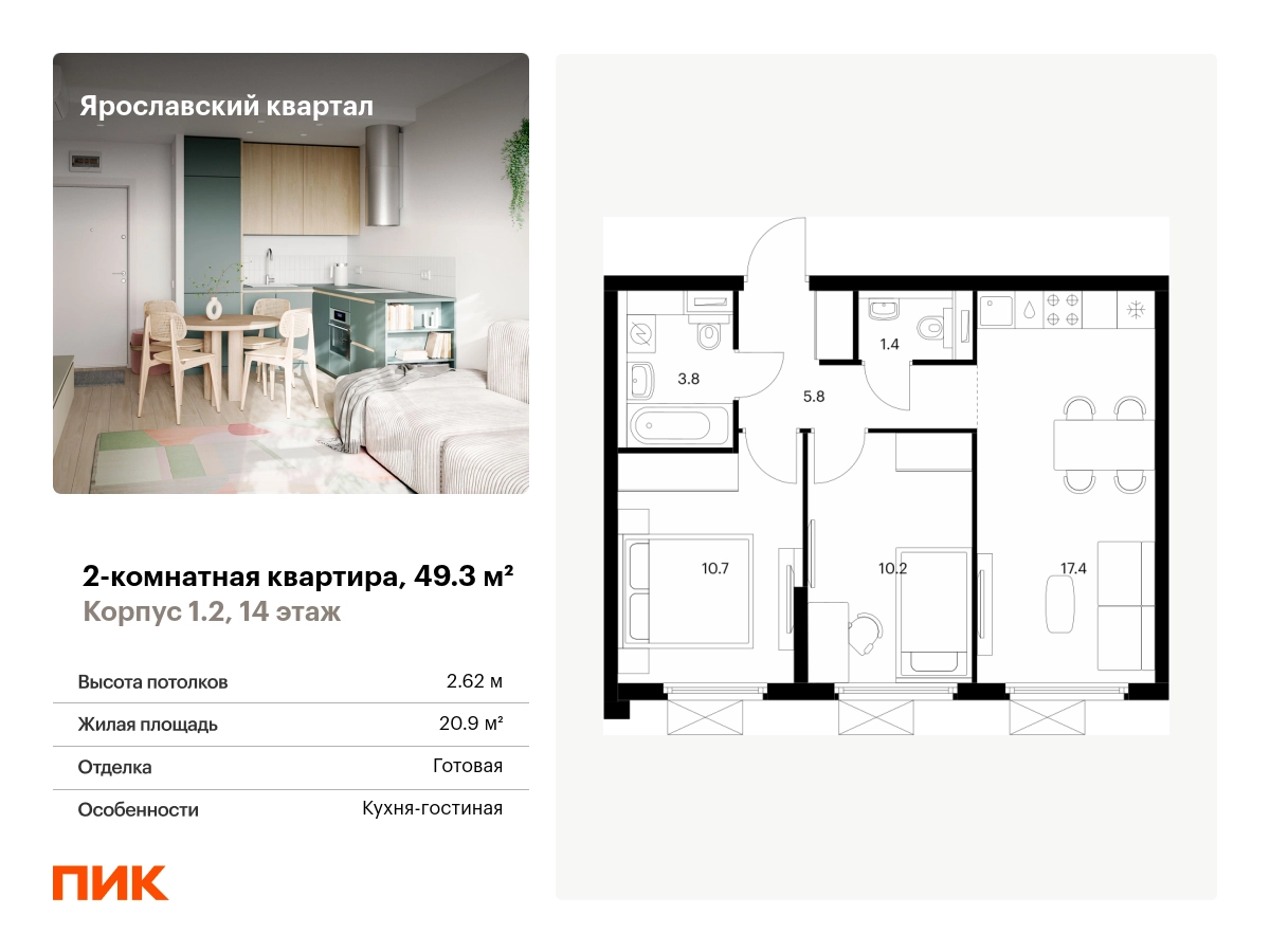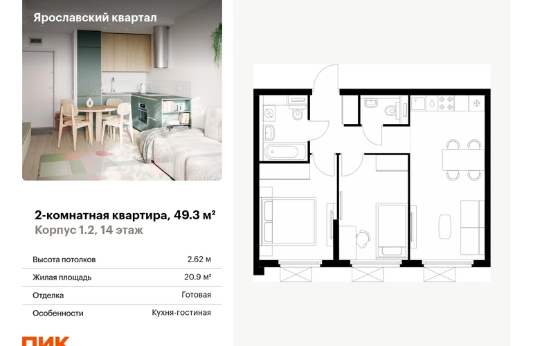Продаётся 2-комн.квартира площадью 49.30 кв.м на 14 этаже 25 этажного дома (Корпус 1.2, секция 1) проекта ПИК Ярославский квартал. Светлый просторный подъезд на уровне земли, функциональная планировка, большие окна, с отделкой. <br> <br>Проект «Ярославский квартал» возводится в Мытищах, в 6 км от МКАД. Жилой квартал, состоящий из 8 корпусов, строится рядом с Ярославским шоссе и имеет удобный заезд с крупной автомагистрали. <br> <br>На территории проекта появится школа, детский сад и пешеходный бульвар. Индивидуальные дизайны фасадов для «Ярославского квартала» разработало петербургское архитектурное бюро RHIZOME. В их портфолио вошли работы для Московского музея современного искусства, ГЦСИ, Манифеста 10 и ЦВЗ Манеж. <br> <br>За 7 минут можно дойти пешком до ближайшей автобусной остановки. Столько же займёт дорога до «Лосиного острова» — облагороженного парка с разными активностями для всей семьи, благоустроенными зонами для отдыха, местами для прогулок и пробежек на свежем воздухе. <br> <br>Доехать на автомобиле до Ярославского шоссе получится за 3 минуты, до станции «Мытищи» — за 9 минут, до МКАД — за 15 минут. Артикул - 910808О застройщике