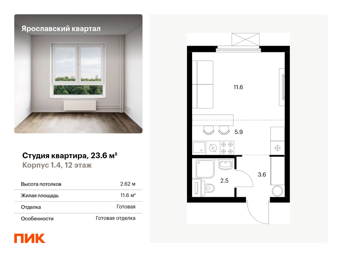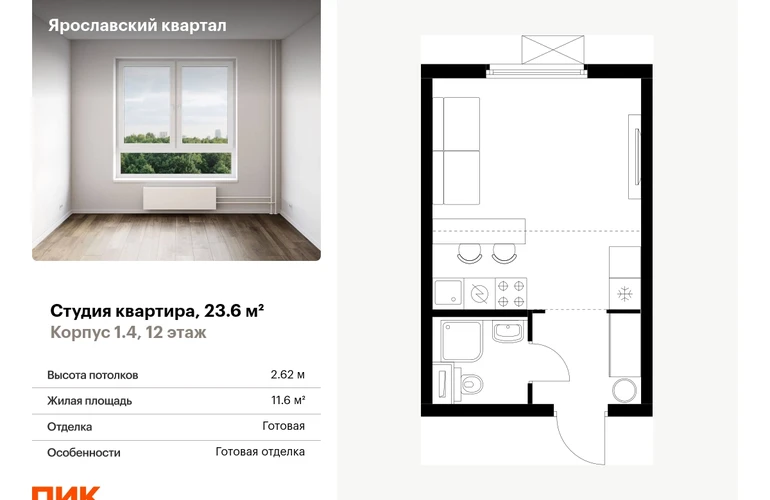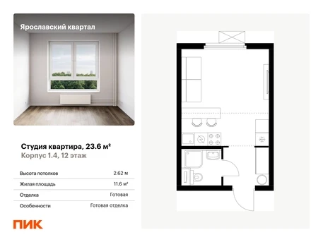 Продаётся квартира-студия площадью 23.60 кв.м на 12 этаже 25 этажного дома (Корпус 1.4, секция 1) проекта ПИК Ярославский квартал. Светлый просторный подъезд на уровне земли, функциональная планировка, большие окна, с отделкой. <br> <br>Проект «Ярославский квартал» возводится в Мытищах, в 6 км от МКАД. Жилой квартал, состоящий из 8 корпусов, строится рядом с Ярославским шоссе и имеет удобный заезд с крупной автомагистрали. <br> <br>На территории проекта появится школа, детский сад и пешеходный бульвар. Индивидуальные дизайны фасадов для «Ярославского квартала» разработало петербургское архитектурное бюро RHIZOME. В их портфолио вошли работы для Московского музея современного искусства, ГЦСИ, Манифеста 10 и ЦВЗ Манеж. <br> <br>За 7 минут можно дойти пешком до ближайшей автобусной остановки. Столько же займёт дорога до «Лосиного острова» — облагороженного парка с разными активностями для всей семьи, благоустроенными зонами для отдыха, местами для прогулок и пробежек на свежем воздухе. <br> <br>Доехать на автомобиле до Ярославского шоссе получится за 3 минуты, до станции «Мытищи» — за 9 минут, до МКАД — за 15 минут. Артикул - 911470О застройщике