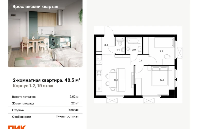 Продаётся 2-комн.квартира площадью 48.50 кв.м на 19 этаже 25 этажного дома (Корпус 1.2, секция 1) проекта ПИК Ярославский квартал. Светлый просторный подъезд на уровне земли, функциональная планировка, большие окна, с отделкой. Проект «Ярославский квартал» возводится в Мытищах, в 6 км от МКАД. Жилой квартал, состоящий из 8 корпусов, строится рядом с Ярославским шоссе и имеет удобный заезд с крупной автомагистрали. На территории проекта появится школа, детский сад и пешеходный бульвар. Индивидуальные дизайны фасадов для «Ярославского квартала» разработало петербургское архитектурное бюро RHIZOME. В их портфолио вошли работы для Московского музея современного искусства, ГЦСИ, Манифеста 10 и ЦВЗ Манеж. За 7 минут можно дойти пешком до ближайшей автобусной остановки. Столько же займёт дорога до «Лосиного острова» — облагороженного парка с разными активностями для всей семьи, благоустроенными зонами для отдыха, местами для прогулок и пробежек на свежем воздухе. Доехать на автомобиле до Ярославского шоссе получится за 3 минуты, до станции «Мытищи» — за 9 минут, до МКАД — за 15 минут. Артикул - 910942О застройщике