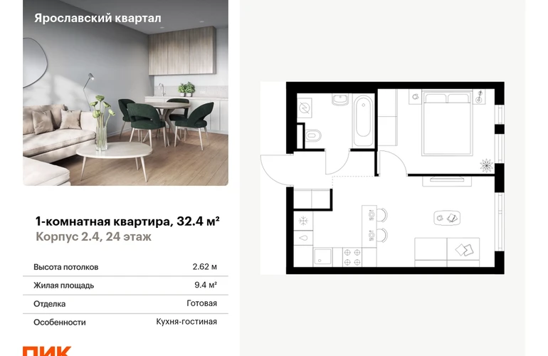 Продаётся 1-комн.квартира площадью 32.40 кв.м на 24 этаже 25 этажного дома (Корпус 2.4, секция 1) проекта ПИК Ярославский квартал. Светлый просторный подъезд на уровне земли, функциональная планировка, большие окна, с отделкой. Проект «Ярославский квартал» возводится в Мытищах, в 6 км от МКАД. Жилой квартал, состоящий из 8 корпусов, строится рядом с Ярославским шоссе и имеет удобный заезд с крупной автомагистрали. На территории проекта появится школа, детский сад и пешеходный бульвар. Индивидуальные дизайны фасадов для «Ярославского квартала» разработало петербургское архитектурное бюро RHIZOME. В их портфолио вошли работы для Московского музея современного искусства, ГЦСИ, Манифеста 10 и ЦВЗ Манеж. За 7 минут можно дойти пешком до ближайшей автобусной остановки. Столько же займёт дорога до «Лосиного острова» — облагороженного парка с разными активностями для всей семьи, благоустроенными зонами для отдыха, местами для прогулок и пробежек на свежем воздухе. Доехать на автомобиле до Ярославского шоссе получится за 3 минуты, до станции «Мытищи» — за 9 минут, до МКАД — за 15 минут. Артикул - 1013637О застройщике