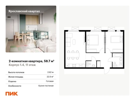 Продаётся 2-комн.квартира площадью 58.70 кв.м на 11 этаже 25 этажного дома (Корпус 1.4, секция 1) проекта ПИК Ярославский квартал. Светлый просторный подъезд на уровне земли, функциональная планировка, большие окна, с отделкой. <br> <br>Проект «Ярославский квартал» возводится в Мытищах, в 6 км от МКАД. Жилой квартал, состоящий из 8 корпусов, строится рядом с Ярославским шоссе и имеет удобный заезд с крупной автомагистрали. <br> <br>На территории проекта появится школа, детский сад и пешеходный бульвар. Индивидуальные дизайны фасадов для «Ярославского квартала» разработало петербургское архитектурное бюро RHIZOME. В их портфолио вошли работы для Московского музея современного искусства, ГЦСИ, Манифеста 10 и ЦВЗ Манеж. <br> <br>За 7 минут можно дойти пешком до ближайшей автобусной остановки. Столько же займёт дорога до «Лосиного острова» — облагороженного парка с разными активностями для всей семьи, благоустроенными зонами для отдыха, местами для прогулок и пробежек на свежем воздухе. <br> <br>Доехать на автомобиле до Ярославского шоссе получится за 3 минуты, до станции «Мытищи» — за 9 минут, до МКАД — за 15 минут. Артикул - 911440О застройщике