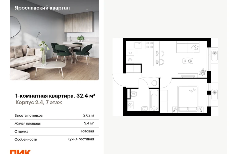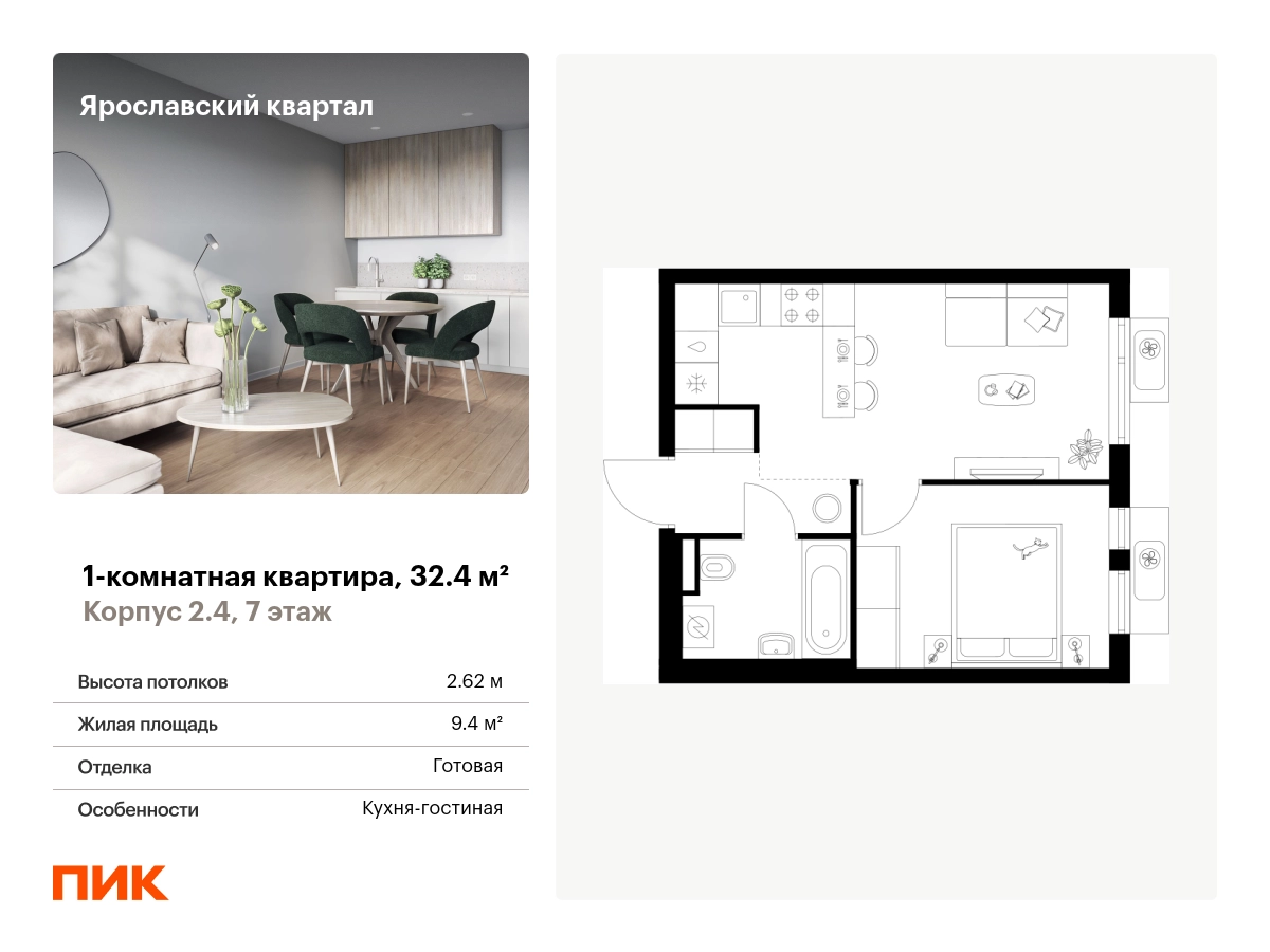 Продаётся 1-комн.квартира площадью 32.40 кв.м на 7 этаже 25 этажного дома (Корпус 2.4, секция 1) проекта ПИК Ярославский квартал. Светлый просторный подъезд на уровне земли, функциональная планировка, большие окна, с отделкой. <br> <br>Проект «Ярославский квартал» возводится в Мытищах, в 6 км от МКАД. Жилой квартал, состоящий из 8 корпусов, строится рядом с Ярославским шоссе и имеет удобный заезд с крупной автомагистрали. <br> <br>На территории проекта появится школа, детский сад и пешеходный бульвар. Индивидуальные дизайны фасадов для «Ярославского квартала» разработало петербургское архитектурное бюро RHIZOME. В их портфолио вошли работы для Московского музея современного искусства, ГЦСИ, Манифеста 10 и ЦВЗ Манеж. <br> <br>За 7 минут можно дойти пешком до ближайшей автобусной остановки. Столько же займёт дорога до «Лосиного острова» — облагороженного парка с разными активностями для всей семьи, благоустроенными зонами для отдыха, местами для прогулок и пробежек на свежем воздухе. <br> <br>Доехать на автомобиле до Ярославского шоссе получится за 3 минуты, до станции «Мытищи» — за 9 минут, до МКАД — за 15 минут. Артикул - 1013412О застройщике