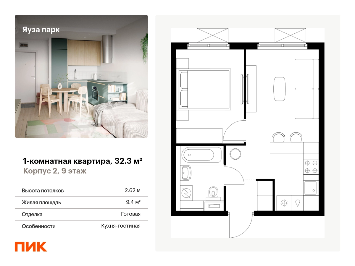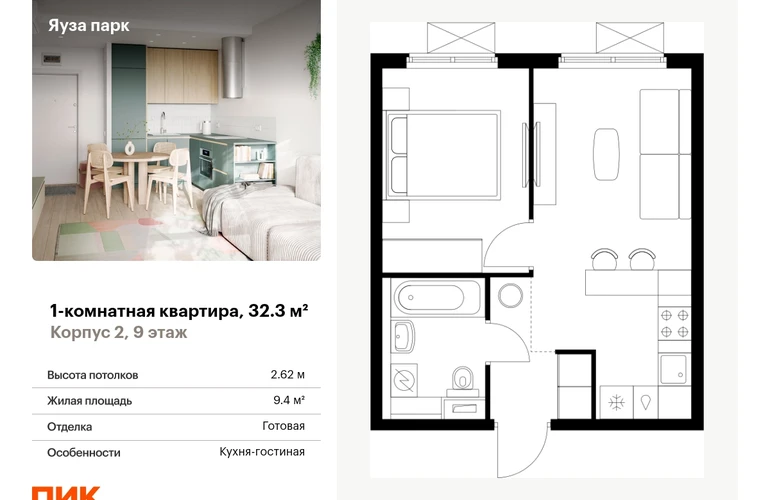 Продаётся 1-комн.квартира площадью 32.30 кв.м на 9 этаже 25 этажного дома (Корпус 2, секция 1) проекта ПИК Яуза парк. Светлый просторный подъезд на уровне земли, функциональная планировка, большие окна, с отделкой. <br> <br>Жилой квартал «Яуза парк» возводится в Мытищах, в 5 минутах ходьбы от одноимённой ж/д станции. <br> <br>Проект включает 20 домов разной этажности с благоустроенными дворами-парками. <br> <br>Индивидуальный дизайн фасадов разработали архитектурные бюро KATARSIS и RHIZOME. <br> <br>Вблизи жилого квартала появятся шумопоглощающие экраны, позволяющие забыть о том, что неподалёку находятся железнодорожные пути. На первых этажах домов откроются магазины, кафе, салоны красоты и другие полезные сервисы. Рядом есть школы и детские сады, магазины и ТРЦ «Красный кит». <br> <br>На территории проекта появится благоустроенная набережная реки Яузы и пешеходный бульвар для прогулок всей семьёй. Водонапорную башню XIX века, расположенную на территории «Яуза парка», мы реставрируем и создадим вокруг неё общественное пространство для отдыха жителей квартала. <br> <br>Для прогулок отлично подойдёт Мытищинский центральный парк культуры и отдыха, расположенный в 10 минутах ходьбы, и Лосиный остров — в 24 минутах. Дорога на автомобиле до Ярославского шоссе займёт не более 3 минут, до МКАД — 10 минут. Артикул - 904825О застройщике