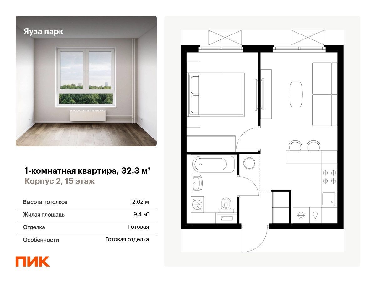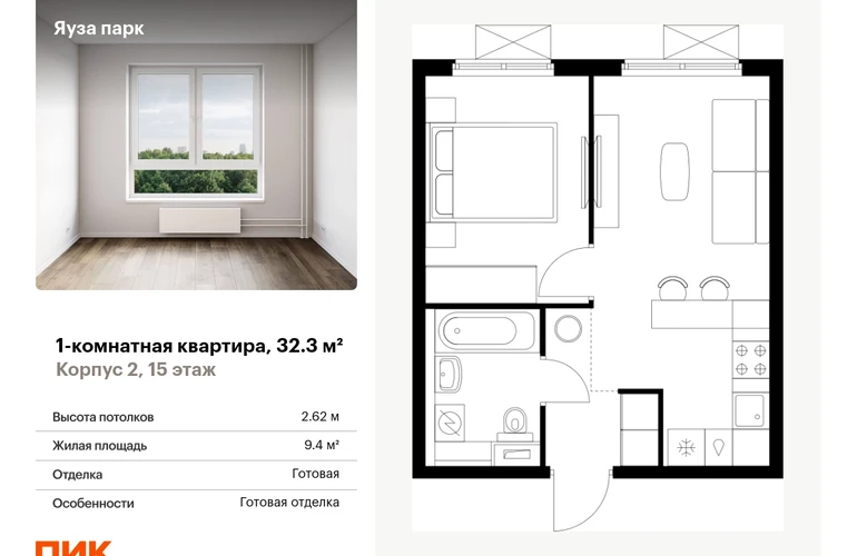 Продаётся 1-комн.квартира площадью 32.30 кв.м на 15 этаже 25 этажного дома (Корпус 2, секция 1) проекта ПИК Яуза парк. Светлый просторный подъезд на уровне земли, функциональная планировка, большие окна, с отделкой. <br> <br>Жилой квартал «Яуза парк» возводится в Мытищах, в 5 минутах ходьбы от одноимённой ж/д станции. <br> <br>Проект включает 20 домов разной этажности с благоустроенными дворами-парками. <br> <br>Индивидуальный дизайн фасадов разработали архитектурные бюро KATARSIS и RHIZOME. <br> <br>Вблизи жилого квартала появятся шумопоглощающие экраны, позволяющие забыть о том, что неподалёку находятся железнодорожные пути. На первых этажах домов откроются магазины, кафе, салоны красоты и другие полезные сервисы. Рядом есть школы и детские сады, магазины и ТРЦ «Красный кит». <br> <br>На территории проекта появится благоустроенная набережная реки Яузы и пешеходный бульвар для прогулок всей семьёй. Водонапорную башню XIX века, расположенную на территории «Яуза парка», мы реставрируем и создадим вокруг неё общественное пространство для отдыха жителей квартала. <br> <br>Для прогулок отлично подойдёт Мытищинский центральный парк культуры и отдыха, расположенный в 10 минутах ходьбы, и Лосиный остров — в 24 минутах. Дорога на автомобиле до Ярославского шоссе займёт не более 3 минут, до МКАД — 10 минут. Артикул - 904903О застройщике