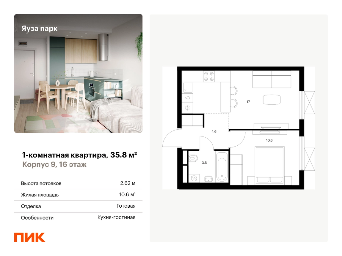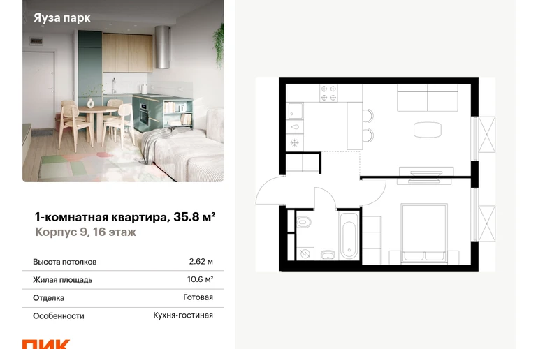 Продаётся 1-комн.квартира площадью 35.80 кв.м на 16 этаже 25 этажного дома (Корпус 9, секция 1) проекта ПИК Яуза парк. Светлый просторный подъезд на уровне земли, функциональная планировка, большие окна, с отделкой. Жилой квартал «Яуза парк» возводится в Мытищах, в 5 минутах ходьбы от одноимённой ж/д станции. Проект включает 20 домов разной этажности с благоустроенными дворами-парками. Индивидуальный дизайн фасадов разработали архитектурные бюро KATARSIS и RHIZOME. Вблизи жилого квартала появятся шумопоглощающие экраны, позволяющие забыть о том, что неподалёку находятся железнодорожные пути. На первых этажах домов откроются магазины, кафе, салоны красоты и другие полезные сервисы. Рядом есть школы и детские сады, магазины и ТРЦ «Красный кит». На территории проекта появится благоустроенная набережная реки Яузы и пешеходный бульвар для прогулок всей семьёй. Водонапорную башню XIX века, расположенную на территории «Яуза парка», мы реставрируем и создадим вокруг неё общественное пространство для отдыха жителей квартала. Для прогулок отлично подойдёт Мытищинский центральный парк культуры и отдыха, расположенный в 10 минутах ходьбы, и Лосиный остров — в 24 минутах. Дорога на автомобиле до Ярославского шоссе займёт не более 3 минут, до МКАД — 10 минут. Артикул - 998288О застройщике