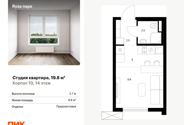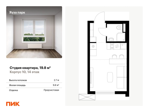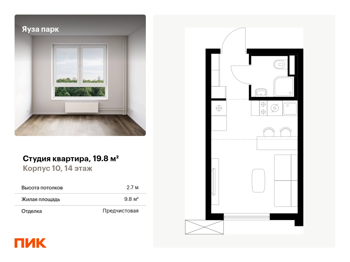 Продаётся квартира-студия площадью 19.80 кв.м на 14 этаже 24 этажного дома (Корпус 10, секция 1) проекта ПИК Яуза парк. Светлый просторный подъезд на уровне земли, функциональная планировка, большие окна, с отделкой. <br> <br>Жилой квартал «Яуза парк» возводится в Мытищах, в 5 минутах ходьбы от одноимённой ж/д станции. <br> <br>Проект включает 20 домов разной этажности с благоустроенными дворами-парками. <br> <br>Индивидуальный дизайн фасадов разработали архитектурные бюро KATARSIS и RHIZOME. <br> <br>Вблизи жилого квартала появятся шумопоглощающие экраны, позволяющие забыть о том, что неподалёку находятся железнодорожные пути. На первых этажах домов откроются магазины, кафе, салоны красоты и другие полезные сервисы. Рядом есть школы и детские сады, магазины и ТРЦ «Красный кит». <br> <br>На территории проекта появится благоустроенная набережная реки Яузы и пешеходный бульвар для прогулок всей семьёй. Водонапорную башню XIX века, расположенную на территории «Яуза парка», мы реставрируем и создадим вокруг неё общественное пространство для отдыха жителей квартала. <br> <br>Для прогулок отлично подойдёт Мытищинский центральный парк культуры и отдыха, расположенный в 10 минутах ходьбы, и Лосиный остров — в 24 минутах. Дорога на автомобиле до Ярославского шоссе займёт не более 3 минут, до МКАД — 10 минут. Артикул - 999394О застройщике