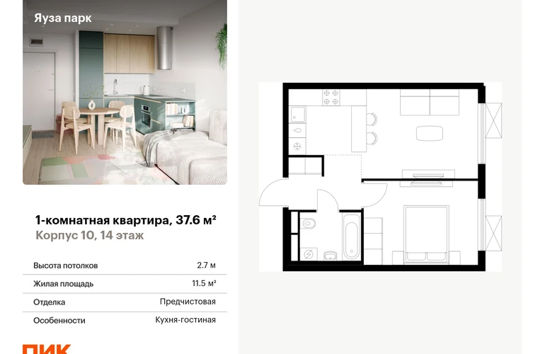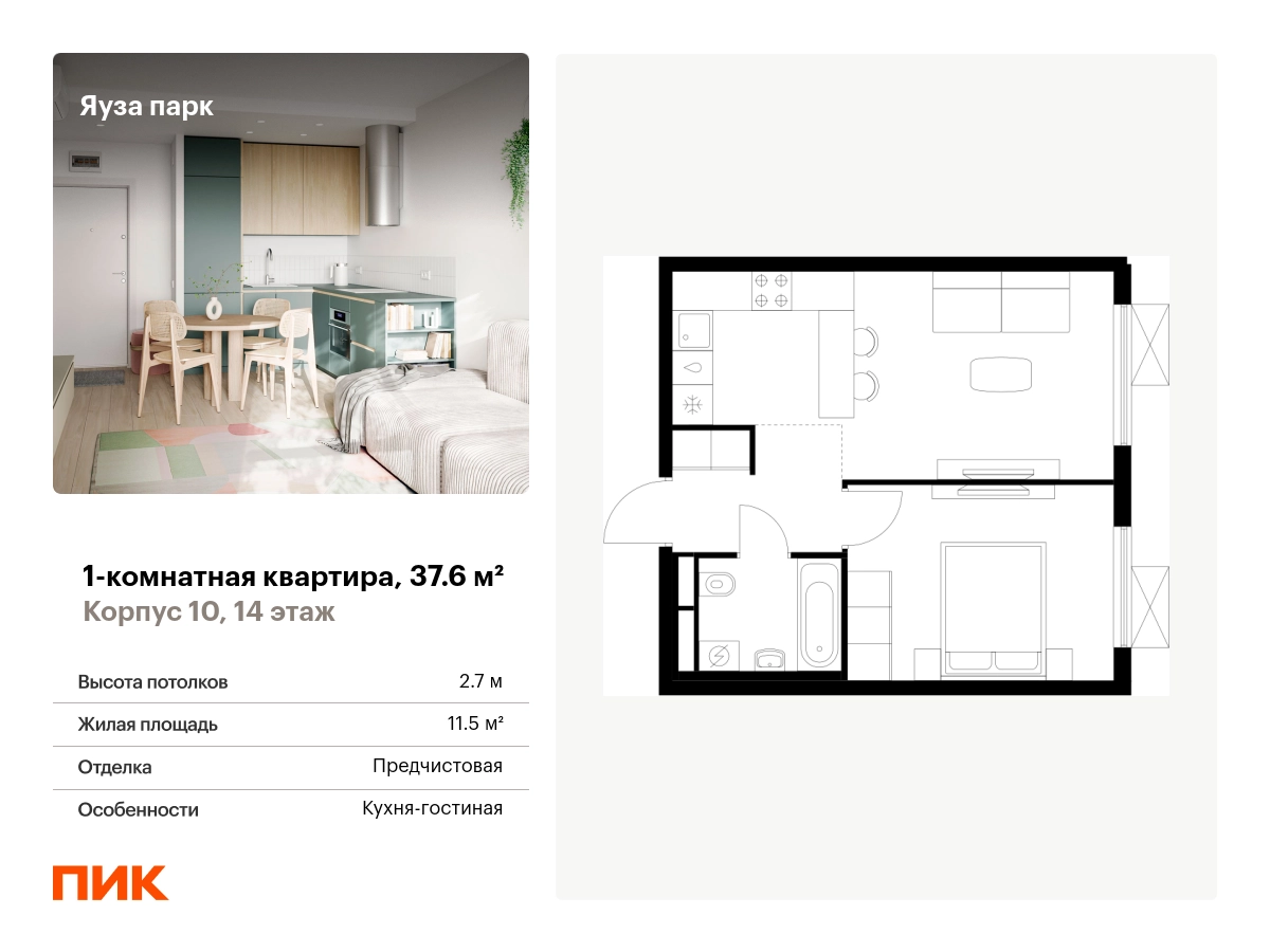 Продаётся 1-комн.квартира площадью 37.60 кв.м на 14 этаже 24 этажного дома (Корпус 10, секция 1) проекта ПИК Яуза парк. Светлый просторный подъезд на уровне земли, функциональная планировка, большие окна, с отделкой. <br> <br>Жилой квартал «Яуза парк» возводится в Мытищах, в 5 минутах ходьбы от одноимённой ж/д станции. <br> <br>Проект включает 20 домов разной этажности с благоустроенными дворами-парками. <br> <br>Индивидуальный дизайн фасадов разработали архитектурные бюро KATARSIS и RHIZOME. <br> <br>Вблизи жилого квартала появятся шумопоглощающие экраны, позволяющие забыть о том, что неподалёку находятся железнодорожные пути. На первых этажах домов откроются магазины, кафе, салоны красоты и другие полезные сервисы. Рядом есть школы и детские сады, магазины и ТРЦ «Красный кит». <br> <br>На территории проекта появится благоустроенная набережная реки Яузы и пешеходный бульвар для прогулок всей семьёй. Водонапорную башню XIX века, расположенную на территории «Яуза парка», мы реставрируем и создадим вокруг неё общественное пространство для отдыха жителей квартала. <br> <br>Для прогулок отлично подойдёт Мытищинский центральный парк культуры и отдыха, расположенный в 10 минутах ходьбы, и Лосиный остров — в 24 минутах. Дорога на автомобиле до Ярославского шоссе займёт не более 3 минут, до МКАД — 10 минут. Артикул - 999403О застройщике