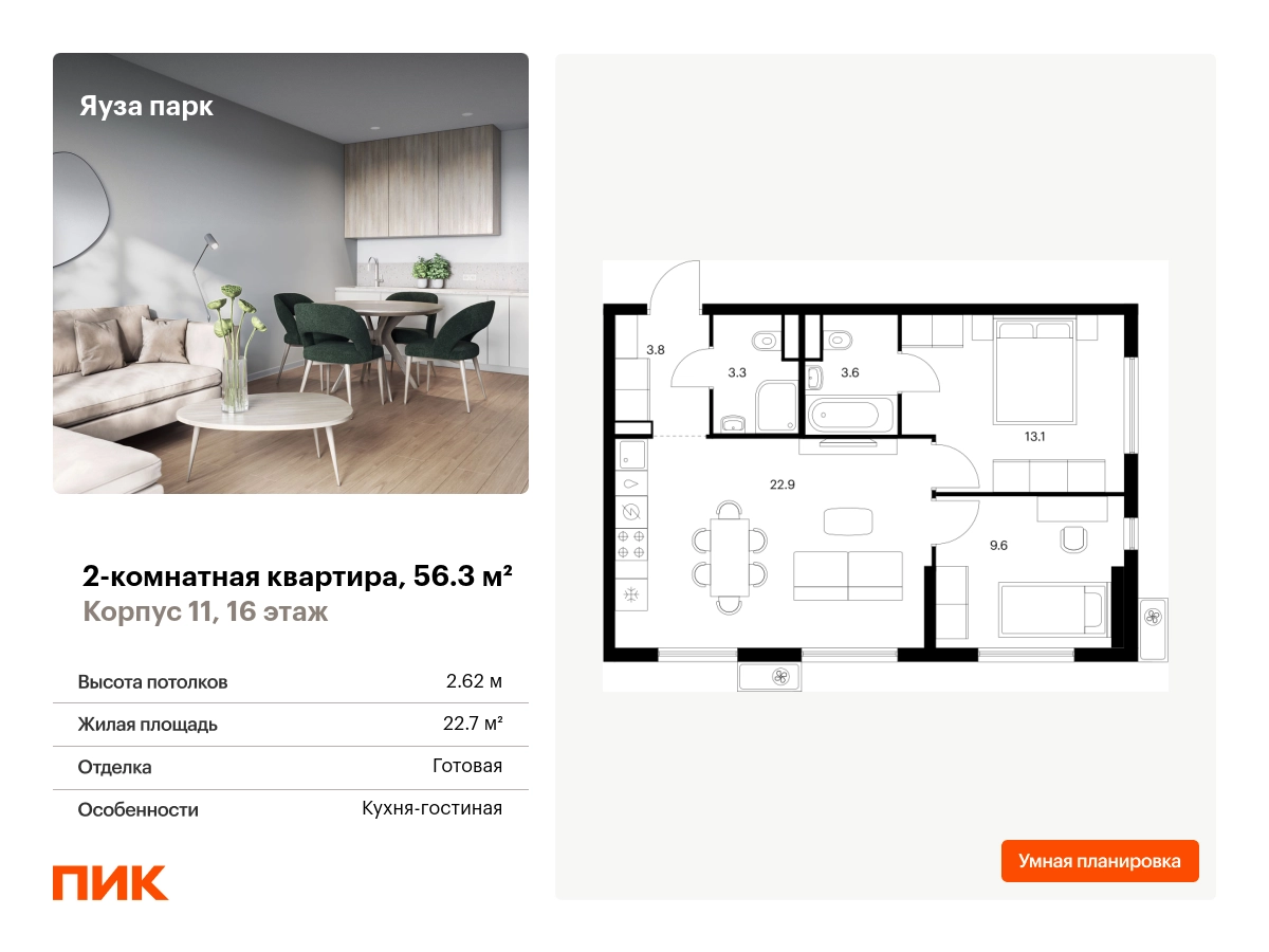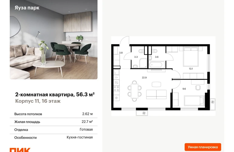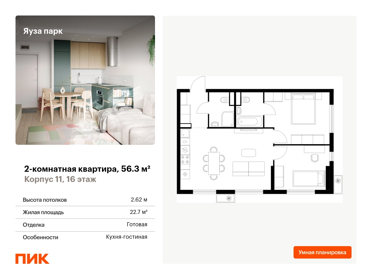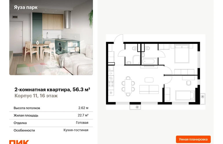 Продаётся 2-комн.квартира площадью 56.30 кв.м на 16 этаже 25 этажного дома (Корпус 11, секция 1) проекта ПИК Яуза парк. Светлый просторный подъезд на уровне земли, функциональная планировка, большие окна, с отделкой. Жилой квартал «Яуза парк» возводится в Мытищах, в 5 минутах ходьбы от одноимённой ж/д станции. Проект включает 20 домов разной этажности с благоустроенными дворами-парками. Индивидуальный дизайн фасадов разработали архитектурные бюро KATARSIS и RHIZOME. Вблизи жилого квартала появятся шумопоглощающие экраны, позволяющие забыть о том, что неподалёку находятся железнодорожные пути. На первых этажах домов откроются магазины, кафе, салоны красоты и другие полезные сервисы. Рядом есть школы и детские сады, магазины и ТРЦ «Красный кит». На территории проекта появится благоустроенная набережная реки Яузы и пешеходный бульвар для прогулок всей семьёй. Водонапорную башню XIX века, расположенную на территории «Яуза парка», мы реставрируем и создадим вокруг неё общественное пространство для отдыха жителей квартала. Для прогулок отлично подойдёт Мытищинский центральный парк культуры и отдыха, расположенный в 10 минутах ходьбы, и Лосиный остров — в 24 минутах. Дорога на автомобиле до Ярославского шоссе займёт не более 3 минут, до МКАД — 10 минут. Артикул - 1000190О застройщике