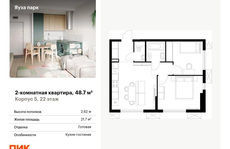 Продаётся 2-комн.квартира площадью 48.70 кв.м на 22 этаже 24 этажного дома (Корпус 5, секция 1) проекта ПИК Яуза парк. Светлый просторный подъезд на уровне земли, функциональная планировка, большие окна, с отделкой. <br> <br>Жилой квартал «Яуза парк» возводится в Мытищах, в 5 минутах ходьбы от одноимённой ж/д станции. <br> <br>Проект включает 20 домов разной этажности с благоустроенными дворами-парками. <br> <br>Индивидуальный дизайн фасадов разработали архитектурные бюро KATARSIS и RHIZOME. <br> <br>Вблизи жилого квартала появятся шумопоглощающие экраны, позволяющие забыть о том, что неподалёку находятся железнодорожные пути. На первых этажах домов откроются магазины, кафе, салоны красоты и другие полезные сервисы. Рядом есть школы и детские сады, магазины и ТРЦ «Красный кит». <br> <br>На территории проекта появится благоустроенная набережная реки Яузы и пешеходный бульвар для прогулок всей семьёй. Водонапорную башню XIX века, расположенную на территории «Яуза парка», мы реставрируем и создадим вокруг неё общественное пространство для отдыха жителей квартала. <br> <br>Для прогулок отлично подойдёт Мытищинский центральный парк культуры и отдыха, расположенный в 10 минутах ходьбы, и Лосиный остров — в 24 минутах. Дорога на автомобиле до Ярославского шоссе займёт не более 3 минут, до МКАД — 10 минут. Артикул - 940595О застройщике