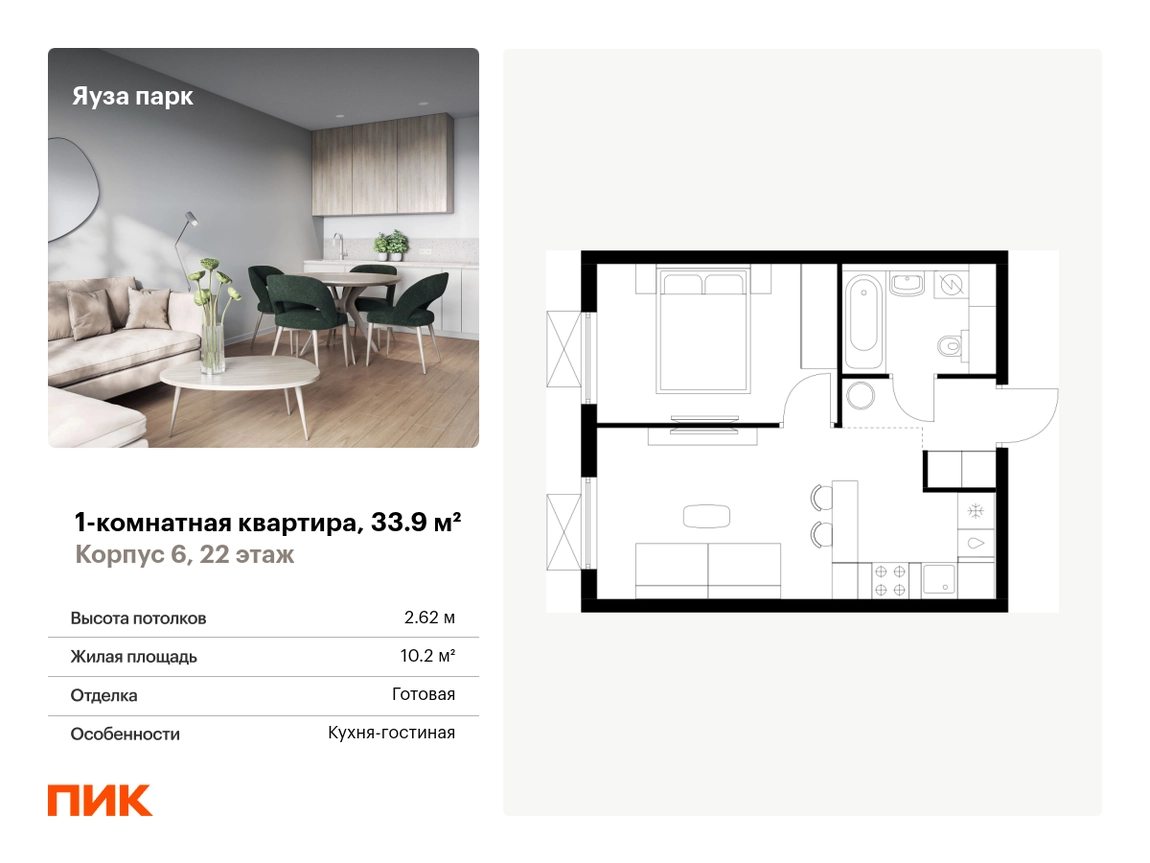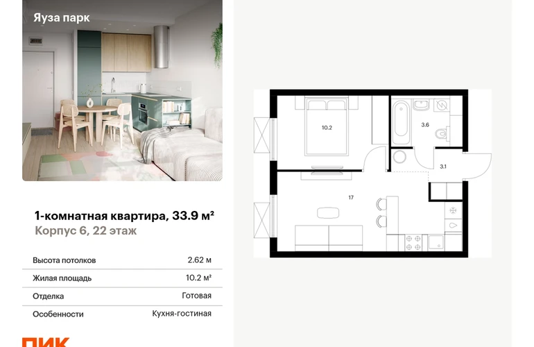 Продаётся 1-комн.квартира площадью 33.90 кв.м на 22 этаже 24 этажного дома (Корпус 6, секция 1) проекта ПИК Яуза парк. Светлый просторный подъезд на уровне земли, функциональная планировка, большие окна, с отделкой. <br> <br>Жилой квартал «Яуза парк» возводится в Мытищах, в 5 минутах ходьбы от одноимённой ж/д станции. <br> <br>Проект включает 20 домов разной этажности с благоустроенными дворами-парками. <br> <br>Индивидуальный дизайн фасадов разработали архитектурные бюро KATARSIS и RHIZOME. <br> <br>Вблизи жилого квартала появятся шумопоглощающие экраны, позволяющие забыть о том, что неподалёку находятся железнодорожные пути. На первых этажах домов откроются магазины, кафе, салоны красоты и другие полезные сервисы. Рядом есть школы и детские сады, магазины и ТРЦ «Красный кит». <br> <br>На территории проекта появится благоустроенная набережная реки Яузы и пешеходный бульвар для прогулок всей семьёй. Водонапорную башню XIX века, расположенную на территории «Яуза парка», мы реставрируем и создадим вокруг неё общественное пространство для отдыха жителей квартала. <br> <br>Для прогулок отлично подойдёт Мытищинский центральный парк культуры и отдыха, расположенный в 10 минутах ходьбы, и Лосиный остров — в 24 минутах. Дорога на автомобиле до Ярославского шоссе займёт не более 3 минут, до МКАД — 10 минут. Артикул - 940974О застройщике