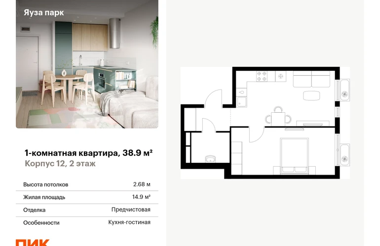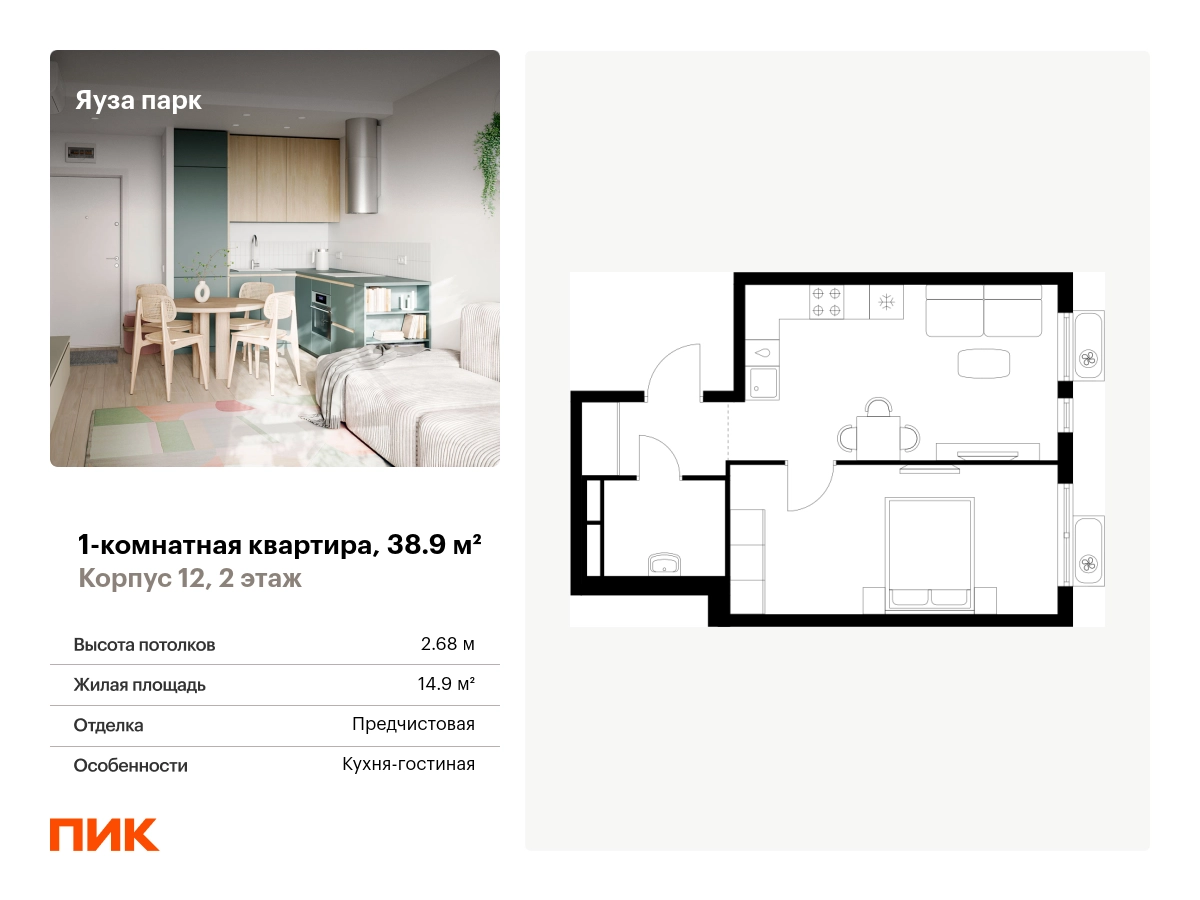 Продаётся 1-комн.квартира площадью 38.90 кв.м на 2 этаже 24 этажного дома (Корпус 12, секция 1) проекта ПИК Яуза парк. Светлый просторный подъезд на уровне земли, функциональная планировка, большие окна, с отделкой. Жилой квартал «Яуза парк» возводится в Мытищах, в 5 минутах ходьбы от одноимённой ж/д станции. Проект включает 20 домов разной этажности с благоустроенными дворами-парками. Индивидуальный дизайн фасадов разработали архитектурные бюро KATARSIS и RHIZOME. Вблизи жилого квартала появятся шумопоглощающие экраны, позволяющие забыть о том, что неподалёку находятся железнодорожные пути. На первых этажах домов откроются магазины, кафе, салоны красоты и другие полезные сервисы. Рядом есть школы и детские сады, магазины и ТРЦ «Красный кит». На территории проекта появится благоустроенная набережная реки Яузы и пешеходный бульвар для прогулок всей семьёй. Водонапорную башню XIX века, расположенную на территории «Яуза парка», мы реставрируем и создадим вокруг неё общественное пространство для отдыха жителей квартала. Для прогулок отлично подойдёт Мытищинский центральный парк культуры и отдыха, расположенный в 10 минутах ходьбы, и Лосиный остров — в 24 минутах. Дорога на автомобиле до Ярославского шоссе займёт не более 3 минут, до МКАД — 10 минут. Артикул - 1000614О застройщике