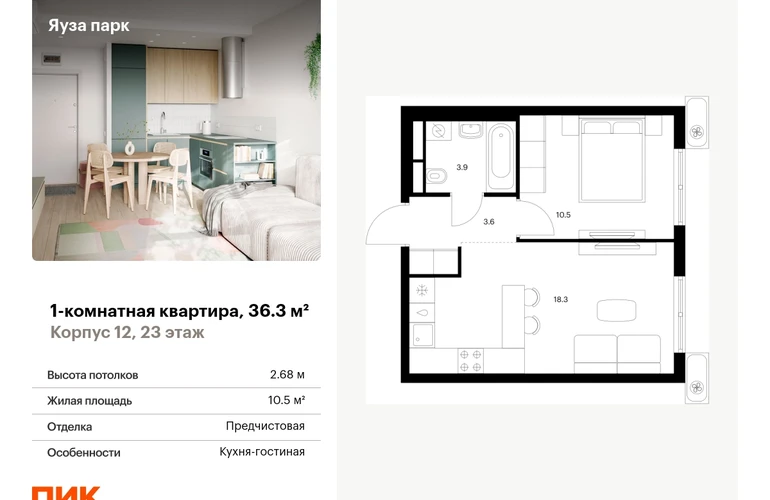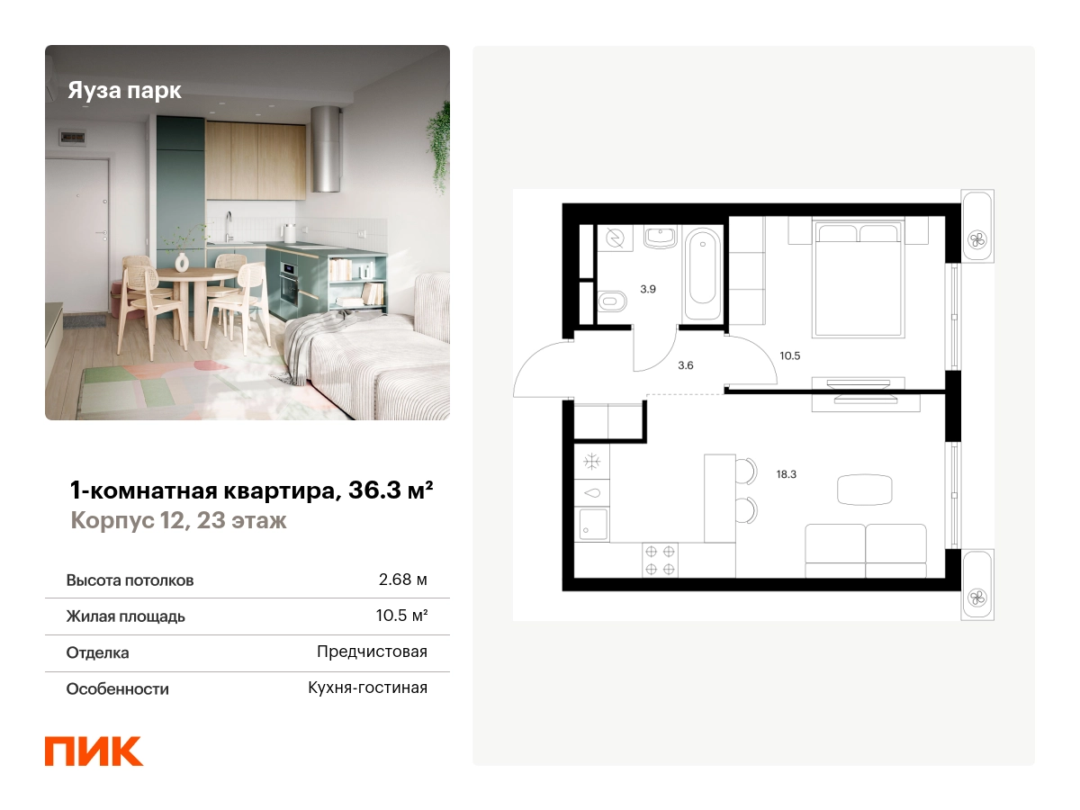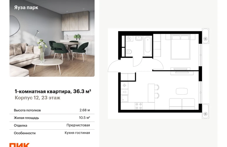 Продаётся 1-комн.квартира площадью 36.30 кв.м на 23 этаже 24 этажного дома (Корпус 12, секция 1) проекта ПИК Яуза парк. Светлый просторный подъезд на уровне земли, функциональная планировка, большие окна, с отделкой. <br> <br>Жилой квартал «Яуза парк» возводится в Мытищах, в 5 минутах ходьбы от одноимённой ж/д станции. <br> <br>Проект включает 20 домов разной этажности с благоустроенными дворами-парками. <br> <br>Индивидуальный дизайн фасадов разработали архитектурные бюро KATARSIS и RHIZOME. <br> <br>Вблизи жилого квартала появятся шумопоглощающие экраны, позволяющие забыть о том, что неподалёку находятся железнодорожные пути. На первых этажах домов откроются магазины, кафе, салоны красоты и другие полезные сервисы. Рядом есть школы и детские сады, магазины и ТРЦ «Красный кит». <br> <br>На территории проекта появится благоустроенная набережная реки Яузы и пешеходный бульвар для прогулок всей семьёй. Водонапорную башню XIX века, расположенную на территории «Яуза парка», мы реставрируем и создадим вокруг неё общественное пространство для отдыха жителей квартала. <br> <br>Для прогулок отлично подойдёт Мытищинский центральный парк культуры и отдыха, расположенный в 10 минутах ходьбы, и Лосиный остров — в 24 минутах. Дорога на автомобиле до Ярославского шоссе займёт не более 3 минут, до МКАД — 10 минут. Артикул - 1000886О застройщике