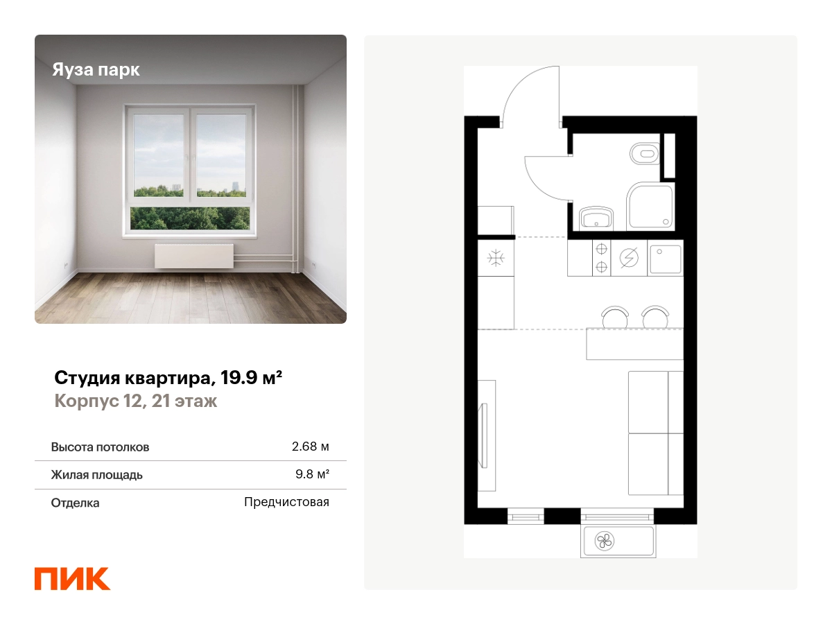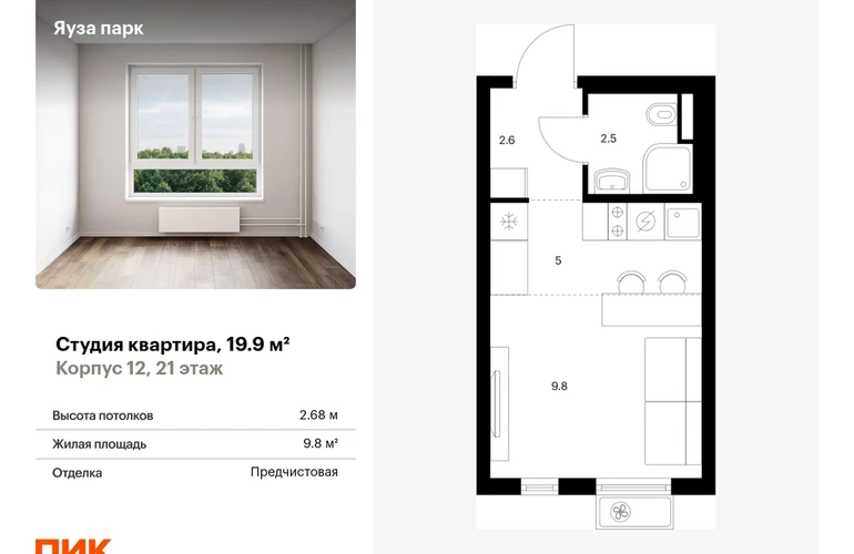 Продаётся квартира-студия площадью 19.90 кв.м на 21 этаже 24 этажного дома (Корпус 12, секция 1) проекта ПИК Яуза парк. Светлый просторный подъезд на уровне земли, функциональная планировка, большие окна, с отделкой. Жилой квартал «Яуза парк» возводится в Мытищах, в 5 минутах ходьбы от одноимённой ж/д станции. Проект включает 20 домов разной этажности с благоустроенными дворами-парками. Индивидуальный дизайн фасадов разработали архитектурные бюро KATARSIS и RHIZOME. Вблизи жилого квартала появятся шумопоглощающие экраны, позволяющие забыть о том, что неподалёку находятся железнодорожные пути. На первых этажах домов откроются магазины, кафе, салоны красоты и другие полезные сервисы. Рядом есть школы и детские сады, магазины и ТРЦ «Красный кит». На территории проекта появится благоустроенная набережная реки Яузы и пешеходный бульвар для прогулок всей семьёй. Водонапорную башню XIX века, расположенную на территории «Яуза парка», мы реставрируем и создадим вокруг неё общественное пространство для отдыха жителей квартала. Для прогулок отлично подойдёт Мытищинский центральный парк культуры и отдыха, расположенный в 10 минутах ходьбы, и Лосиный остров — в 24 минутах. Дорога на автомобиле до Ярославского шоссе займёт не более 3 минут, до МКАД — 10 минут. Артикул - 1000854О застройщике