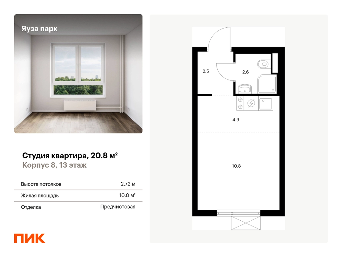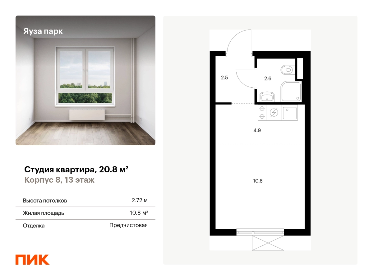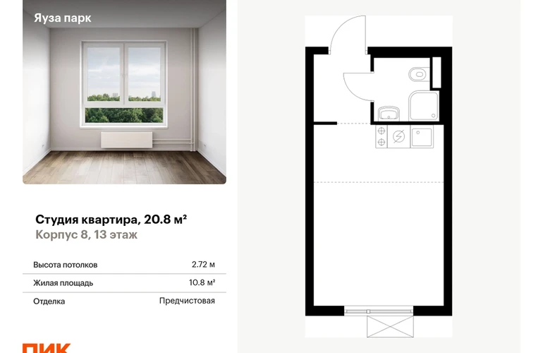 Продаётся квартира-студия площадью 20.80 кв.м на 13 этаже 24 этажного дома (Корпус 8, секция 1) проекта ПИК Яуза парк. Светлый просторный подъезд на уровне земли, функциональная планировка, большие окна, с отделкой. Жилой квартал «Яуза парк» возводится в Мытищах, в 5 минутах ходьбы от одноимённой ж/д станции. Проект включает 20 домов разной этажности с благоустроенными дворами-парками. Индивидуальный дизайн фасадов разработали архитектурные бюро KATARSIS и RHIZOME. Вблизи жилого квартала появятся шумопоглощающие экраны, позволяющие забыть о том, что неподалёку находятся железнодорожные пути. На первых этажах домов откроются магазины, кафе, салоны красоты и другие полезные сервисы. Рядом есть школы и детские сады, магазины и ТРЦ «Красный кит». На территории проекта появится благоустроенная набережная реки Яузы и пешеходный бульвар для прогулок всей семьёй. Водонапорную башню XIX века, расположенную на территории «Яуза парка», мы реставрируем и создадим вокруг неё общественное пространство для отдыха жителей квартала. Для прогулок отлично подойдёт Мытищинский центральный парк культуры и отдыха, расположенный в 10 минутах ходьбы, и Лосиный остров — в 24 минутах. Дорога на автомобиле до Ярославского шоссе займёт не более 3 минут, до МКАД — 10 минут. Артикул - 997046О застройщике