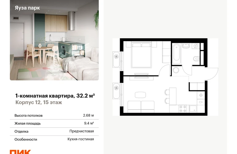 Продаётся 1-комн.квартира площадью 32.20 кв.м на 15 этаже 24 этажного дома (Корпус 12, секция 1) проекта ПИК Яуза парк. Светлый просторный подъезд на уровне земли, функциональная планировка, большие окна, с отделкой. <br> <br>Жилой квартал «Яуза парк» возводится в Мытищах, в 5 минутах ходьбы от одноимённой ж/д станции. <br> <br>Проект включает 20 домов разной этажности с благоустроенными дворами-парками. <br> <br>Индивидуальный дизайн фасадов разработали архитектурные бюро KATARSIS и RHIZOME. <br> <br>Вблизи жилого квартала появятся шумопоглощающие экраны, позволяющие забыть о том, что неподалёку находятся железнодорожные пути. На первых этажах домов откроются магазины, кафе, салоны красоты и другие полезные сервисы. Рядом есть школы и детские сады, магазины и ТРЦ «Красный кит». <br> <br>На территории проекта появится благоустроенная набережная реки Яузы и пешеходный бульвар для прогулок всей семьёй. Водонапорную башню XIX века, расположенную на территории «Яуза парка», мы реставрируем и создадим вокруг неё общественное пространство для отдыха жителей квартала. <br> <br>Для прогулок отлично подойдёт Мытищинский центральный парк культуры и отдыха, расположенный в 10 минутах ходьбы, и Лосиный остров — в 24 минутах. Дорога на автомобиле до Ярославского шоссе займёт не более 3 минут, до МКАД — 10 минут. Артикул - 1000779О застройщике