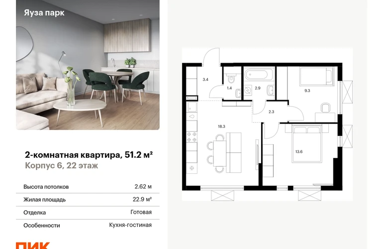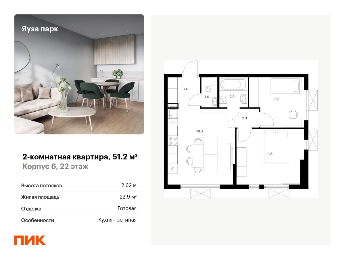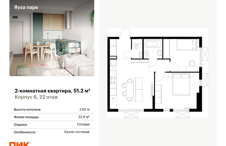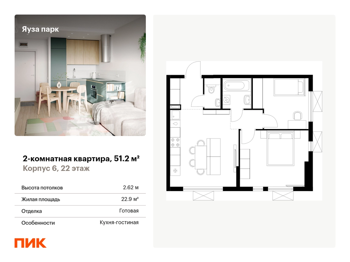 Продаётся 2-комн.квартира площадью 51.20 кв.м на 22 этаже 24 этажного дома (Корпус 6, секция 1) проекта ПИК Яуза парк. Светлый просторный подъезд на уровне земли, функциональная планировка, большие окна, с отделкой. Жилой квартал «Яуза парк» возводится в Мытищах, в 5 минутах ходьбы от одноимённой ж/д станции. Проект включает 20 домов разной этажности с благоустроенными дворами-парками. Индивидуальный дизайн фасадов разработали архитектурные бюро KATARSIS и RHIZOME. Вблизи жилого квартала появятся шумопоглощающие экраны, позволяющие забыть о том, что неподалёку находятся железнодорожные пути. На первых этажах домов откроются магазины, кафе, салоны красоты и другие полезные сервисы. Рядом есть школы и детские сады, магазины и ТРЦ «Красный кит». На территории проекта появится благоустроенная набережная реки Яузы и пешеходный бульвар для прогулок всей семьёй. Водонапорную башню XIX века, расположенную на территории «Яуза парка», мы реставрируем и создадим вокруг неё общественное пространство для отдыха жителей квартала. Для прогулок отлично подойдёт Мытищинский центральный парк культуры и отдыха, расположенный в 10 минутах ходьбы, и Лосиный остров — в 24 минутах. Дорога на автомобиле до Ярославского шоссе займёт не более 3 минут, до МКАД — 10 минут. Артикул - 940971О застройщике