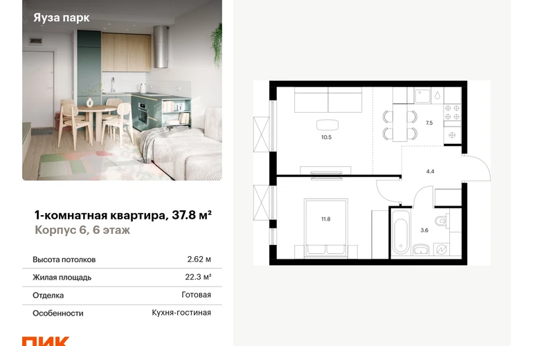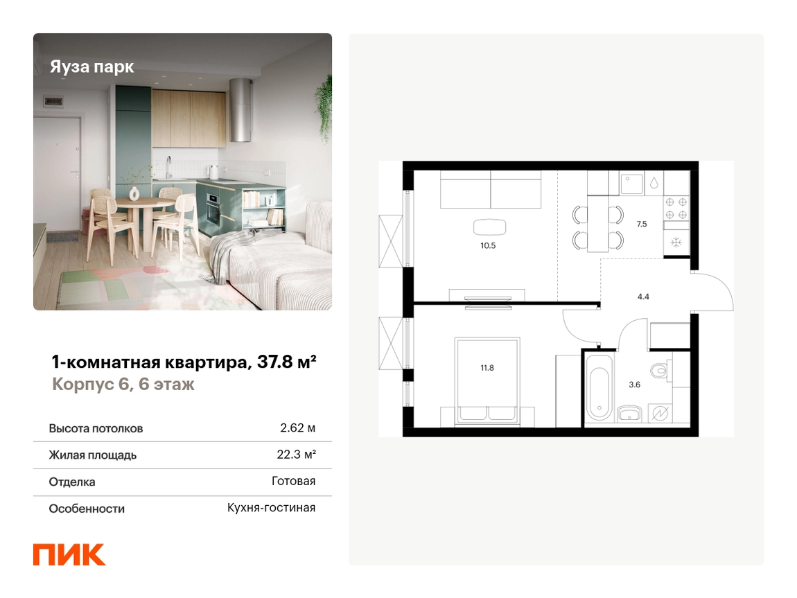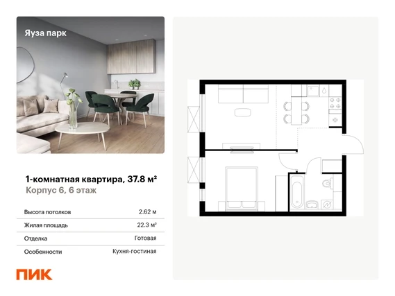 Продаётся 1-комн.квартира площадью 37.80 кв.м на 6 этаже 24 этажного дома (Корпус 6, секция 1) проекта ПИК Яуза парк. Светлый просторный подъезд на уровне земли, функциональная планировка, большие окна, с отделкой. Жилой квартал «Яуза парк» возводится в Мытищах, в 5 минутах ходьбы от одноимённой ж/д станции. Проект включает 20 домов разной этажности с благоустроенными дворами-парками. Индивидуальный дизайн фасадов разработали архитектурные бюро KATARSIS и RHIZOME. Вблизи жилого квартала появятся шумопоглощающие экраны, позволяющие забыть о том, что неподалёку находятся железнодорожные пути. На первых этажах домов откроются магазины, кафе, салоны красоты и другие полезные сервисы. Рядом есть школы и детские сады, магазины и ТРЦ «Красный кит». На территории проекта появится благоустроенная набережная реки Яузы и пешеходный бульвар для прогулок всей семьёй. Водонапорную башню XIX века, расположенную на территории «Яуза парка», мы реставрируем и создадим вокруг неё общественное пространство для отдыха жителей квартала. Для прогулок отлично подойдёт Мытищинский центральный парк культуры и отдыха, расположенный в 10 минутах ходьбы, и Лосиный остров — в 24 минутах. Дорога на автомобиле до Ярославского шоссе займёт не более 3 минут, до МКАД — 10 минут. Артикул - 940717О застройщике