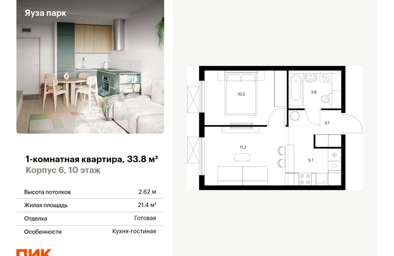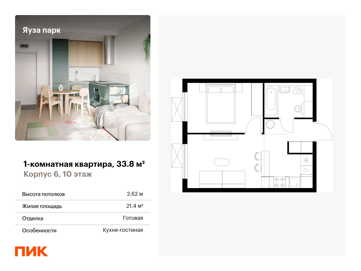 Продаётся 1-комн.квартира площадью 33.80 кв.м на 10 этаже 24 этажного дома (Корпус 6, секция 1) проекта ПИК Яуза парк. Светлый просторный подъезд на уровне земли, функциональная планировка, большие окна, с отделкой. <br> <br>Жилой квартал «Яуза парк» возводится в Мытищах, в 5 минутах ходьбы от одноимённой ж/д станции. <br> <br>Проект включает 20 домов разной этажности с благоустроенными дворами-парками. <br> <br>Индивидуальный дизайн фасадов разработали архитектурные бюро KATARSIS и RHIZOME. <br> <br>Вблизи жилого квартала появятся шумопоглощающие экраны, позволяющие забыть о том, что неподалёку находятся железнодорожные пути. На первых этажах домов откроются магазины, кафе, салоны красоты и другие полезные сервисы. Рядом есть школы и детские сады, магазины и ТРЦ «Красный кит». <br> <br>На территории проекта появится благоустроенная набережная реки Яузы и пешеходный бульвар для прогулок всей семьёй. Водонапорную башню XIX века, расположенную на территории «Яуза парка», мы реставрируем и создадим вокруг неё общественное пространство для отдыха жителей квартала. <br> <br>Для прогулок отлично подойдёт Мытищинский центральный парк культуры и отдыха, расположенный в 10 минутах ходьбы, и Лосиный остров — в 24 минутах. Дорога на автомобиле до Ярославского шоссе займёт не более 3 минут, до МКАД — 10 минут. Артикул - 940780О застройщике