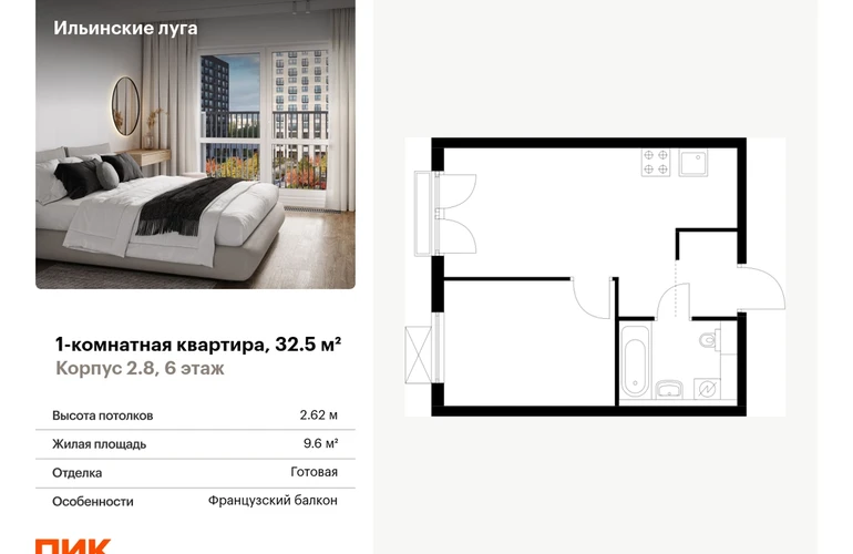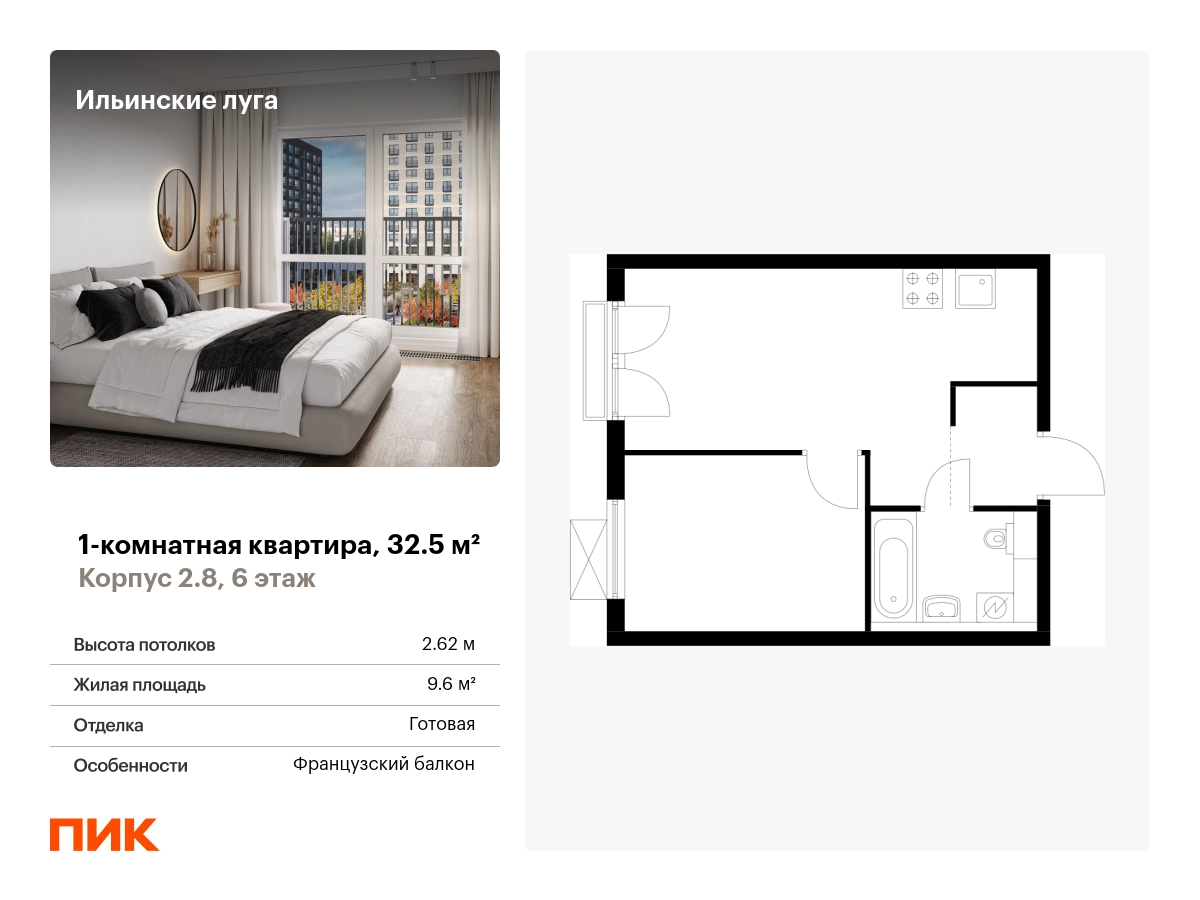 Продаётся 1-комн.квартира площадью 32.50 кв.м на 6 этаже 9 этажного дома (Корпус 2.8, секция 3) проекта ПИК Ильинские луга. Светлый просторный подъезд на уровне земли, функциональная планировка, большие окна, с отделкой. <br> <br>Жилой район «Ильинские луга» находится в 10 километрах от МКАД по Новорижскому шоссе, в 20 минутах на автомобиле от станций метро «Волоколамская», «Тушинская» и «Строгино». В будущем ближе к проекту, в 9 минутах пути на машине, откроется станция «Ильинская» Рублёво-Архангельской линии, которая будет соединять Арбатско-Покровскую линию и Большую кольцевую линию. <br> <br>«Ильинские луга» — масштабный проект, в который входит девять детских садов, четыре школы и поликлиника. Он строится в престижном и экологичном районе среди лесов и памятников природы. За 5 минут от жилого квартала можно доехать до Рублёво-Успенского шоссе, а за 30 минут — до центра Москвы. До крупного торгового центра «РИГАМОЛЛ» всего 5 минут на автомобиле, а до ТЦ «Твой дом» и гипермаркета «Глобус» — 10 минут. <br> <br>В «Ильинских лугах» строятся только девятиэтажные дома — такая архитектура соответствует спокойной жизни за городом. В каждом дворе-парке есть места для отдыха, детские и спортивные площадки. А ещё, здесь уже открыт большой PlayHub «Гравити» — современное игровое пространство с космической тематикой, холмами, зонами для игр и отдыха жителей любого возраста. <br> <br>На первых этажах уже работают магазины, кафе и пекарни. <br> <br>Места для отдыха от «Ильинских лугов» тоже недалеко: 10 минут на машине — и вы в музее-усадьбе «Архангельское». Также рядом находится Лохин остров — памятник природы, где водятся речные черепахи, есть места для кемпинга и возможность сплавиться по реке. Артикул - 942745О застройщике