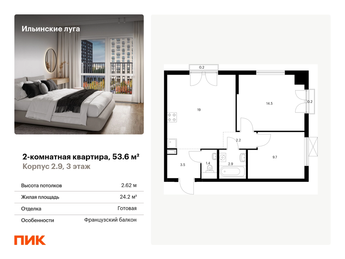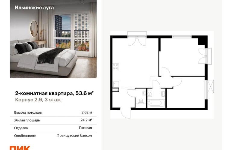 Продаётся 2-комн.квартира площадью 53.60 кв.м на 3 этаже 9 этажного дома (Корпус 2.9, секция 2) проекта ПИК Ильинские луга. Светлый просторный подъезд на уровне земли, функциональная планировка, большие окна, с отделкой. <br> <br>Жилой район «Ильинские луга» находится в 10 километрах от МКАД по Новорижскому шоссе, в 20 минутах на автомобиле от станций метро «Волоколамская», «Тушинская» и «Строгино». В будущем ближе к проекту, в 9 минутах пути на машине, откроется станция «Ильинская» Рублёво-Архангельской линии, которая будет соединять Арбатско-Покровскую линию и Большую кольцевую линию. <br> <br>«Ильинские луга» — масштабный проект, в который входит девять детских садов, четыре школы и поликлиника. Он строится в престижном и экологичном районе среди лесов и памятников природы. За 5 минут от жилого квартала можно доехать до Рублёво-Успенского шоссе, а за 30 минут — до центра Москвы. До крупного торгового центра «РИГАМОЛЛ» всего 5 минут на автомобиле, а до ТЦ «Твой дом» и гипермаркета «Глобус» — 10 минут. <br> <br>В «Ильинских лугах» строятся только девятиэтажные дома — такая архитектура соответствует спокойной жизни за городом. В каждом дворе-парке есть места для отдыха, детские и спортивные площадки. А ещё, здесь уже открыт большой PlayHub «Гравити» — современное игровое пространство с космической тематикой, холмами, зонами для игр и отдыха жителей любого возраста. <br> <br>На первых этажах уже работают магазины, кафе и пекарни. <br> <br>Места для отдыха от «Ильинских лугов» тоже недалеко: 10 минут на машине — и вы в музее-усадьбе «Архангельское». Также рядом находится Лохин остров — памятник природы, где водятся речные черепахи, есть места для кемпинга и возможность сплавиться по реке. Артикул - 933808О застройщике