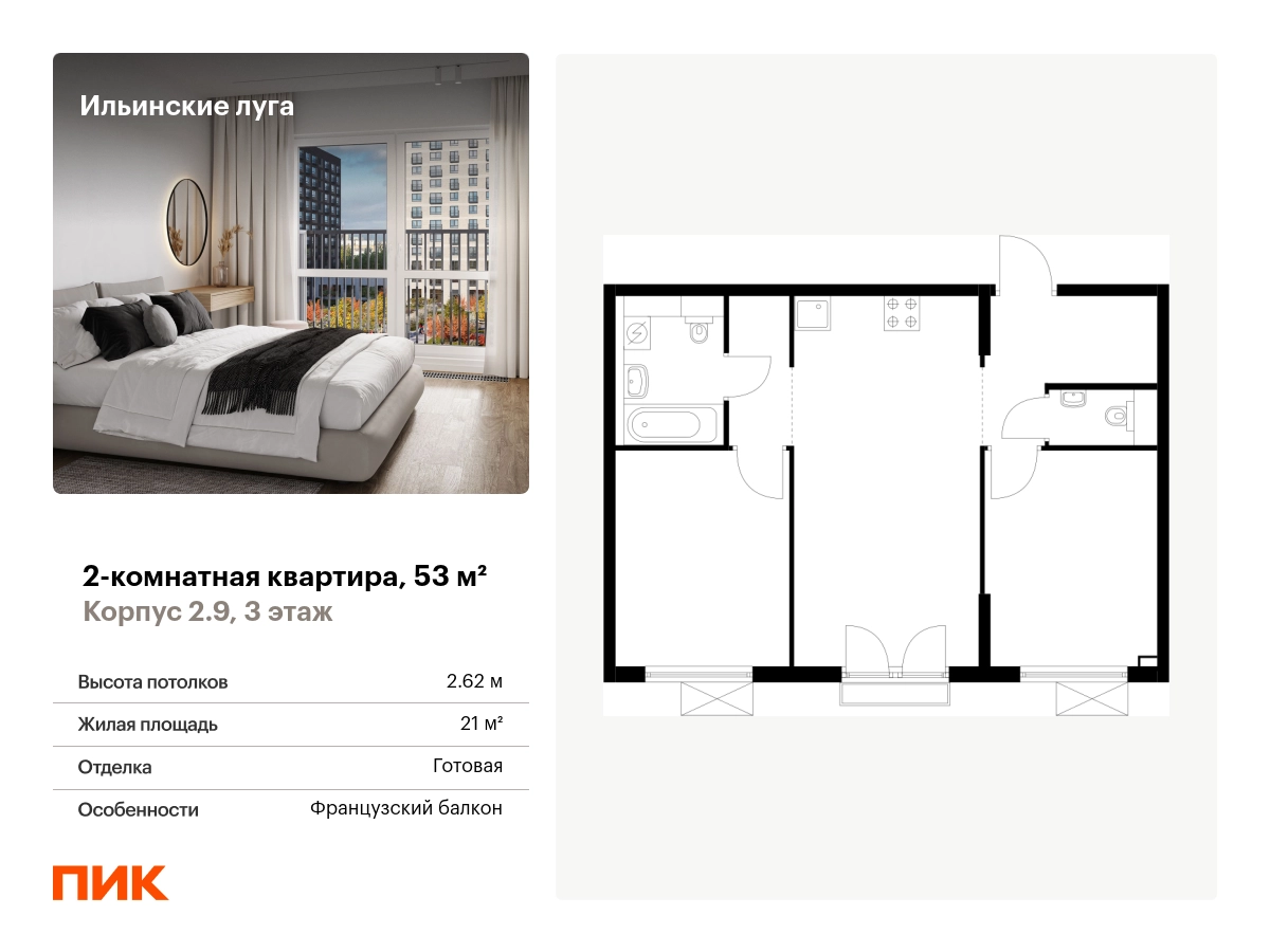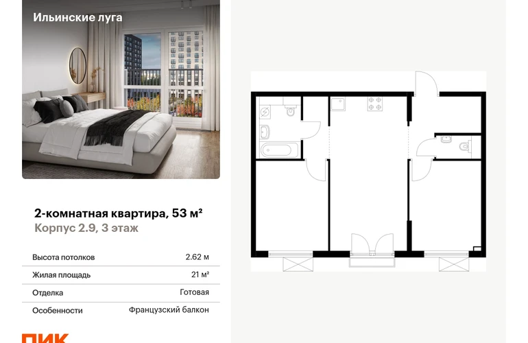 Продаётся 2-комн.квартира площадью 53.00 кв.м на 3 этаже 9 этажного дома (Корпус 2.9, секция 3) проекта ПИК Ильинские луга. Светлый просторный подъезд на уровне земли, функциональная планировка, большие окна, с отделкой. <br> <br>Жилой район «Ильинские луга» находится в 10 километрах от МКАД по Новорижскому шоссе, в 20 минутах на автомобиле от станций метро «Волоколамская», «Тушинская» и «Строгино». В будущем ближе к проекту, в 9 минутах пути на машине, откроется станция «Ильинская» Рублёво-Архангельской линии, которая будет соединять Арбатско-Покровскую линию и Большую кольцевую линию. <br> <br>«Ильинские луга» — масштабный проект, в который входит девять детских садов, четыре школы и поликлиника. Он строится в престижном и экологичном районе среди лесов и памятников природы. За 5 минут от жилого квартала можно доехать до Рублёво-Успенского шоссе, а за 30 минут — до центра Москвы. До крупного торгового центра «РИГАМОЛЛ» всего 5 минут на автомобиле, а до ТЦ «Твой дом» и гипермаркета «Глобус» — 10 минут. <br> <br>В «Ильинских лугах» строятся только девятиэтажные дома — такая архитектура соответствует спокойной жизни за городом. В каждом дворе-парке есть места для отдыха, детские и спортивные площадки. А ещё, здесь уже открыт большой PlayHub «Гравити» — современное игровое пространство с космической тематикой, холмами, зонами для игр и отдыха жителей любого возраста. <br> <br>На первых этажах уже работают магазины, кафе и пекарни. <br> <br>Места для отдыха от «Ильинских лугов» тоже недалеко: 10 минут на машине — и вы в музее-усадьбе «Архангельское». Также рядом находится Лохин остров — памятник природы, где водятся речные черепахи, есть места для кемпинга и возможность сплавиться по реке. Артикул - 933848О застройщике