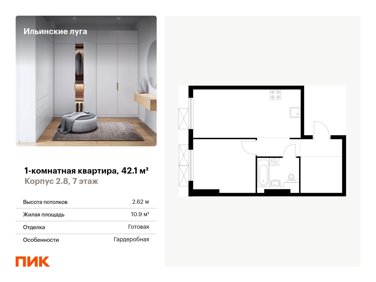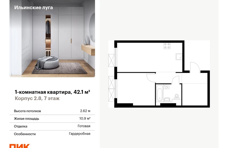 Продаётся 1-комн.квартира площадью 42.10 кв.м на 7 этаже 9 этажного дома (Корпус 2.8, секция 5) проекта ПИК Ильинские луга. Светлый просторный подъезд на уровне земли, функциональная планировка, большие окна, с отделкой. <br> <br>Жилой район «Ильинские луга» находится в 10 километрах от МКАД по Новорижскому шоссе, в 20 минутах на автомобиле от станций метро «Волоколамская», «Тушинская» и «Строгино». В будущем ближе к проекту, в 9 минутах пути на машине, откроется станция «Ильинская» Рублёво-Архангельской линии, которая будет соединять Арбатско-Покровскую линию и Большую кольцевую линию. <br> <br>«Ильинские луга» — масштабный проект, в который входит девять детских садов, четыре школы и поликлиника. Он строится в престижном и экологичном районе среди лесов и памятников природы. За 5 минут от жилого квартала можно доехать до Рублёво-Успенского шоссе, а за 30 минут — до центра Москвы. До крупного торгового центра «РИГАМОЛЛ» всего 5 минут на автомобиле, а до ТЦ «Твой дом» и гипермаркета «Глобус» — 10 минут. <br> <br>В «Ильинских лугах» строятся только девятиэтажные дома — такая архитектура соответствует спокойной жизни за городом. В каждом дворе-парке есть места для отдыха, детские и спортивные площадки. А ещё, здесь уже открыт большой PlayHub «Гравити» — современное игровое пространство с космической тематикой, холмами, зонами для игр и отдыха жителей любого возраста. <br> <br>На первых этажах уже работают магазины, кафе и пекарни. <br> <br>Места для отдыха от «Ильинских лугов» тоже недалеко: 10 минут на машине — и вы в музее-усадьбе «Архангельское». Также рядом находится Лохин остров — памятник природы, где водятся речные черепахи, есть места для кемпинга и возможность сплавиться по реке. Артикул - 942936О застройщике