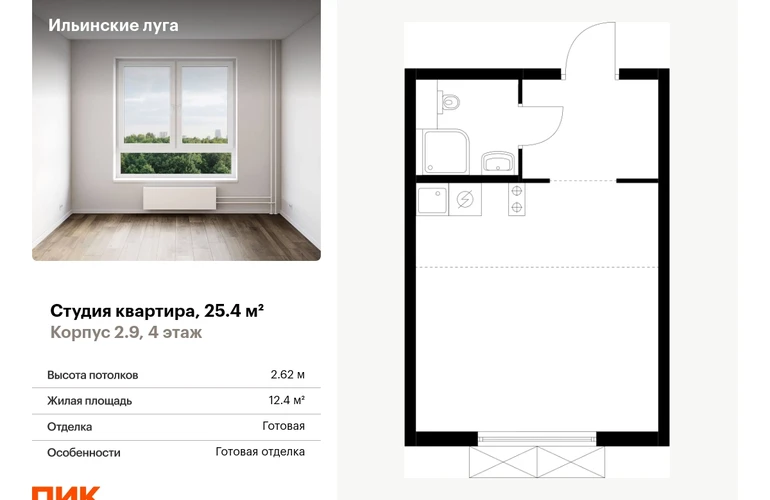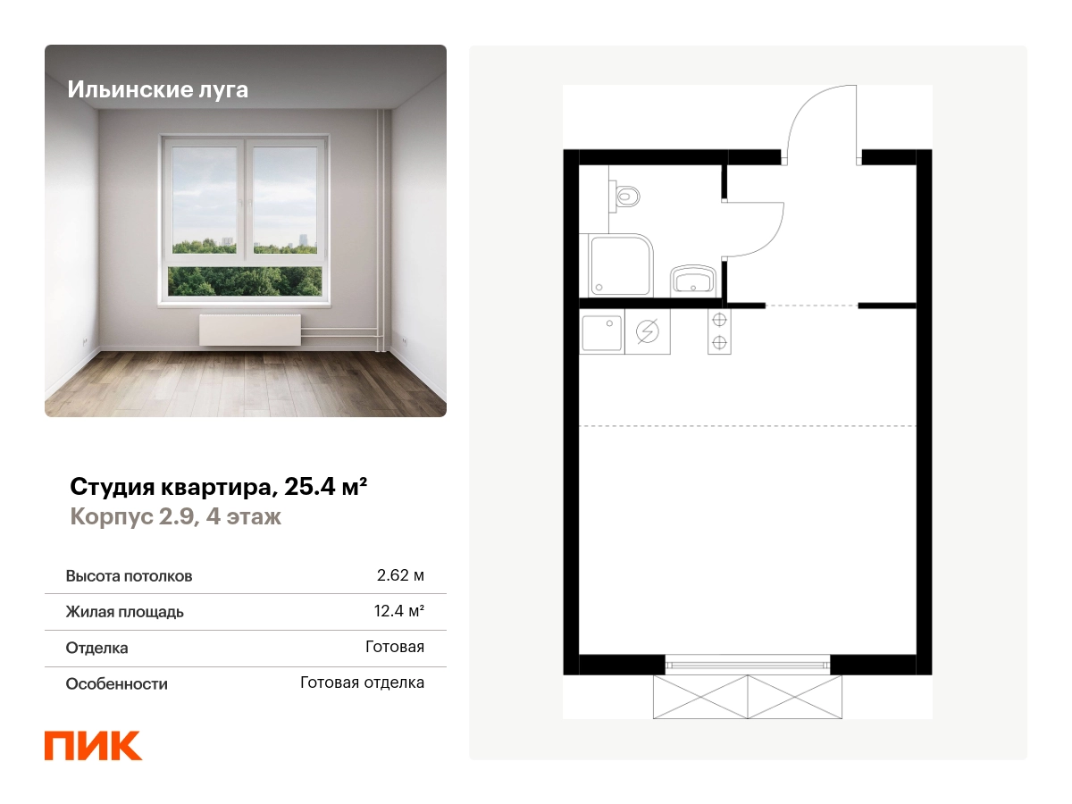 Продаётся квартира-студия площадью 25.40 кв.м на 4 этаже 9 этажного дома (Корпус 2.9, секция 1) проекта ПИК Ильинские луга. Светлый просторный подъезд на уровне земли, функциональная планировка, большие окна, с отделкой. <br> <br>Жилой район «Ильинские луга» находится в 10 километрах от МКАД по Новорижскому шоссе, в 20 минутах на автомобиле от станций метро «Волоколамская», «Тушинская» и «Строгино». В будущем ближе к проекту, в 9 минутах пути на машине, откроется станция «Ильинская» Рублёво-Архангельской линии, которая будет соединять Арбатско-Покровскую линию и Большую кольцевую линию. <br> <br>«Ильинские луга» — масштабный проект, в который входит девять детских садов, четыре школы и поликлиника. Он строится в престижном и экологичном районе среди лесов и памятников природы. За 5 минут от жилого квартала можно доехать до Рублёво-Успенского шоссе, а за 30 минут — до центра Москвы. До крупного торгового центра «РИГАМОЛЛ» всего 5 минут на автомобиле, а до ТЦ «Твой дом» и гипермаркета «Глобус» — 10 минут. <br> <br>В «Ильинских лугах» строятся только девятиэтажные дома — такая архитектура соответствует спокойной жизни за городом. В каждом дворе-парке есть места для отдыха, детские и спортивные площадки. А ещё, здесь уже открыт большой PlayHub «Гравити» — современное игровое пространство с космической тематикой, холмами, зонами для игр и отдыха жителей любого возраста. <br> <br>На первых этажах уже работают магазины, кафе и пекарни. <br> <br>Места для отдыха от «Ильинских лугов» тоже недалеко: 10 минут на машине — и вы в музее-усадьбе «Архангельское». Также рядом находится Лохин остров — памятник природы, где водятся речные черепахи, есть места для кемпинга и возможность сплавиться по реке. Артикул - 933762О застройщике